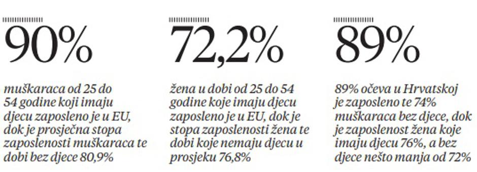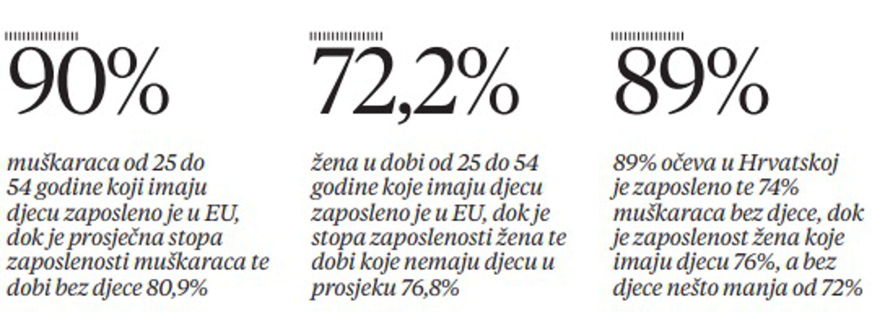 – Razlike u stopama zaposlenosti muškaraca i žena s obzirom na obiteljsku situaciju i manje djece u zemljama EU su očekivane. Najnižu stopu zaposlenosti žena bilježe slabije razvijenije južnoeuropske zemlje koje imaju najslabije razvijenu obiteljsku politiku novčanih transfera obitelji, ali i slabiju dostupnost socijalnih usluga usmjerenih na skrb o djeci. Zemlje s boljim radnim zakonodavstvom koje regulira fleksibilnije radne aranžmane (rad sa skraćenim radnim vremenom, pola radnog vremena i sl.) i razvijenijom infrastrukturom socijalnih usluga za skrb o djeci imaju bitno veću razinu zaposlenosti žena – govori Zdenko Babić, profesor socijalne politike sa zagrebačkog Pravnog fakulteta. Hrvatska, kad je riječ o zaposlenosti žena od 25 do 54 godine koje imaju djecu, odudara od prosjeka EU. Kod nas je zaposleno više žena koje imaju djecu, njih 76%, naspram onih bez djece (72% ). Iako kod nas više žena s djecom radi nego u EU, njihov položaj na tržištu rada je lošiji, primjerice tek ih 2% radi skraćeno.
