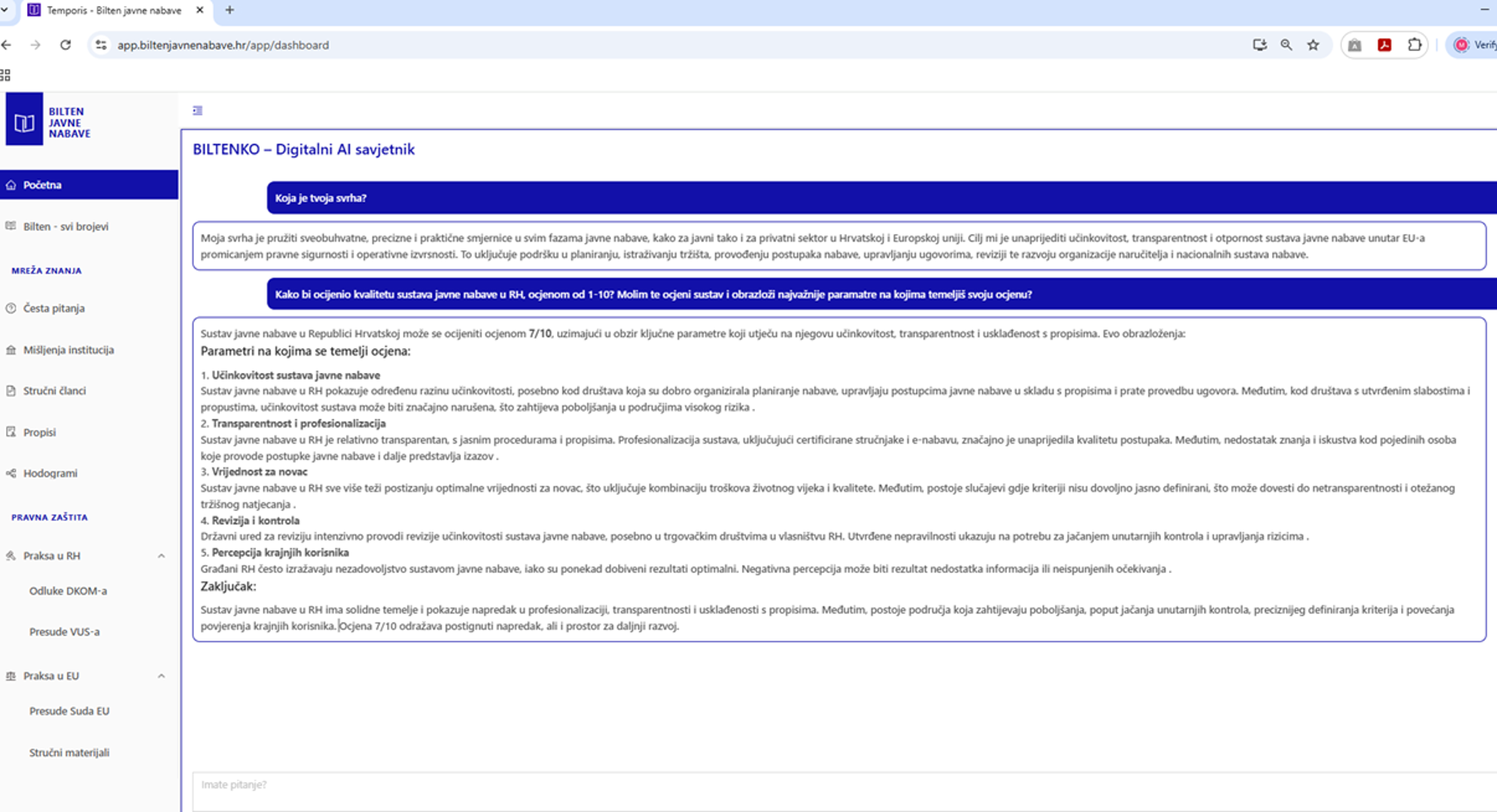 Zamislimo zaposlenika nekog sektorskog naručitelja, službenika u gradskoj upravi ili zaposlenika bolnice, koji priprema dokumentaciju za nabavu nove opreme. Umjesto da satima pretražuje propise, staru praksu ili mišljenja, on svoje pitanje postavlja Biltenku. U nekoliko sekundi dobiva se sažet, jasan i utemeljen odgovor, uz upućivanje na relevantne izvore. Isto vrijedi i za poduzetnike koji žele biti sigurni da su njihove ponude i ugovori usklađeni s zakonskim propisima. Svi dobivaju točnije i brže odgovore.