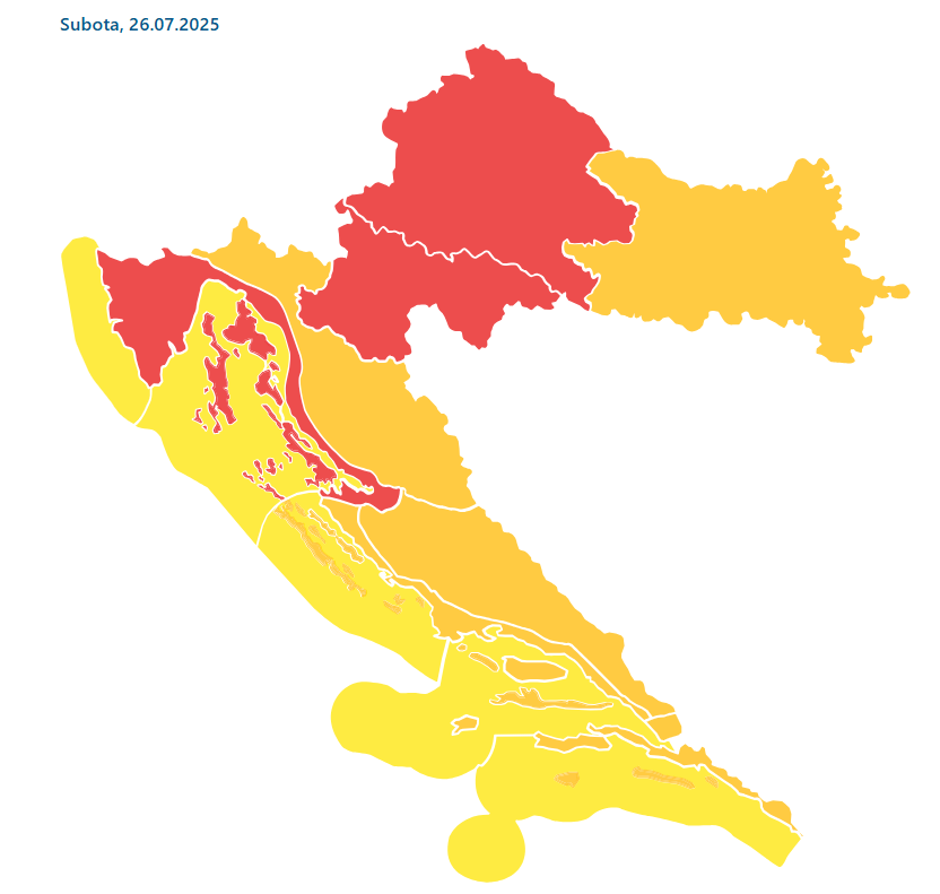 U subotu se očekuje značajno pogoršanje vremena koje će zahvatiti cijelu zemlju, a bit će obilježeno grmljavinom, tučom, jakim vjetrom, obilnom kišom i naglim padom temperature. Najizrazitiji problemi očekuju se u večernjim satima i tijekom noći. Državni hidrometeorološki zavod (DHMZ) izdao je crveno upozorenje za zagrebačku, karlovačku i riječku regiju, dok je za ostatak zemlje aktivirano narančasto upozorenje. "U subotu, 26. srpnja 2025. naše će krajeve zahvatiti izražena termobarička dolina unutar koje se nalazi visinska ciklona. Pritom će nad naše krajeve tijekom dana postupno pristizati i sve nestabilniji i vlagom bogatiji zrak. Prizemno će se duž Jadrana premještati ciklona s pripadajućim frontalnim sustavima i u drugom dijelu nedjelje, 27. srpnja 2025. odmicati istočnije od Hrvatske", objasnili su iz DHMZ-a.