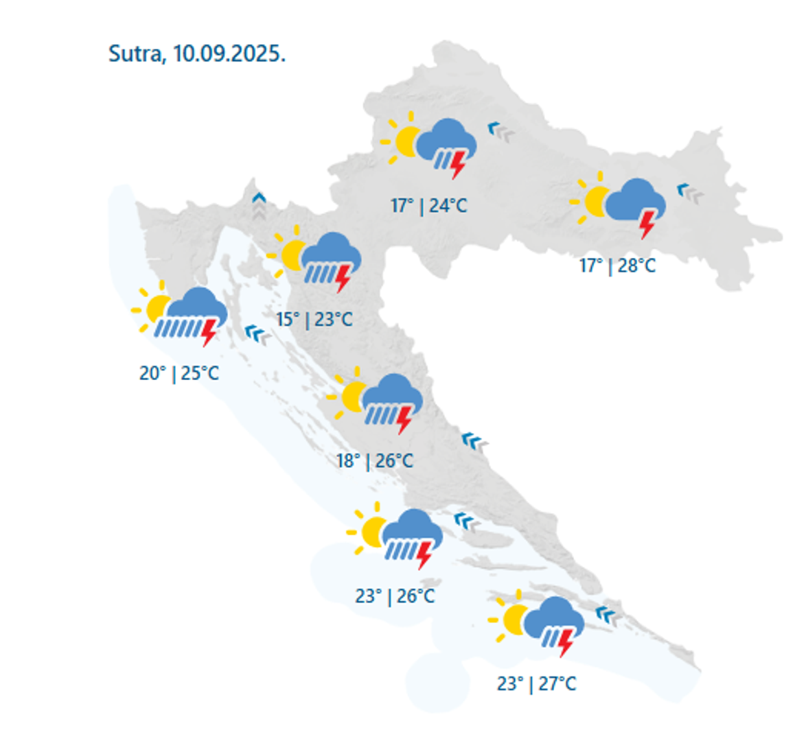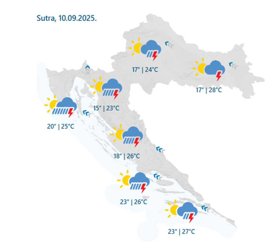 Sjeverni Jadran i Gorska Hrvatska u prvom dijelu dana bit će vjetrovitiji i valovitiji, dok se poslijepodne očekuje djelomično razvedravanje. Jutarnje temperature kretat će se od 14 do 17 stupnjeva, dok će poslijepodnevne dosezati između 20 i 27 stupnjeva, ovisno o regiji. U središnjoj Hrvatskoj poslijepodne će biti toplije i sunčanije nego u srijedu, iako još uvijek mogući lokalni pljuskovi i grmljavina, uz prolazno jak vjetar.
