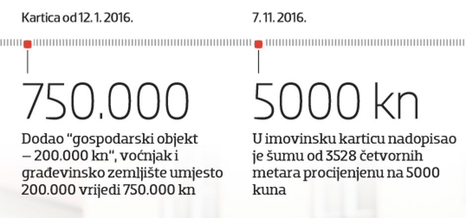 U siječnju 2016. građevinsko zemljište do tada vrijedno 200.000 kuna sada piše da vrijedi 750.000 kuna. I još je dodao voćnjak vrijedan 100.000 kuna i “gospodarski objekt” od 60 metara četvornih procijenjen na 200.000 kuna. To je i u studenome 2016., kad je podnio prvu imovinsku karticu kao ministar graditeljstva i prostornog uređenja, još bio “gospodarski objekt” da bi u listopadu 2017. bio upisan kao “kuća s okućnicom”.