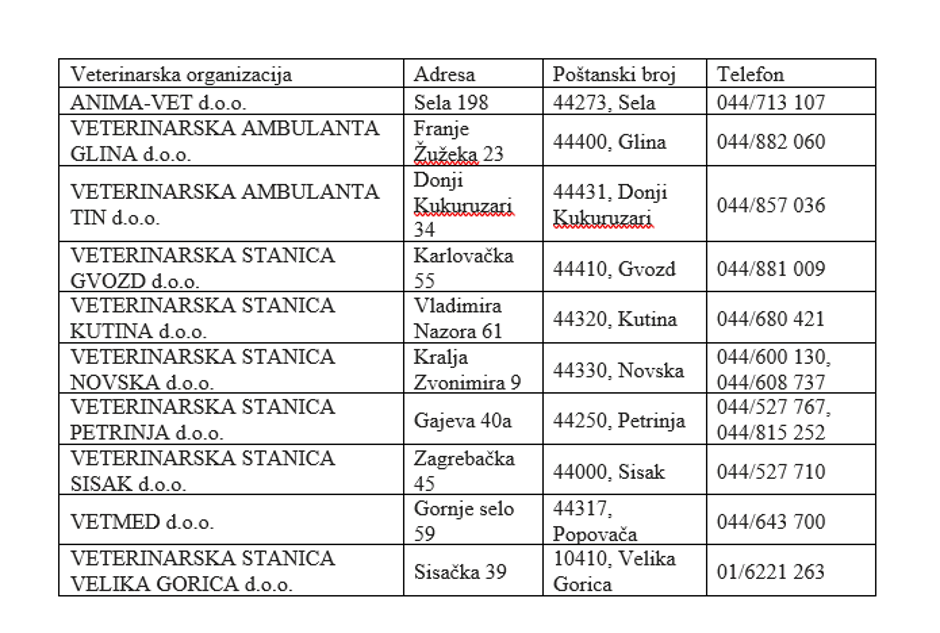 Uprava za veterinarstvo i sigurnost hrane i ovim putem obavještava građane na područjima Sisačko–moslavačke županije pogođenim potresom da je veterinarska služba u pripravnosti te se u slučaju potrebe zbrinjavanja i premještanja životinja, liječenja i pružanja pomoći ozlijeđenim životinjama te sakupljanja lešina mogu javiti svom veterinaru na niže navedene kontakte: