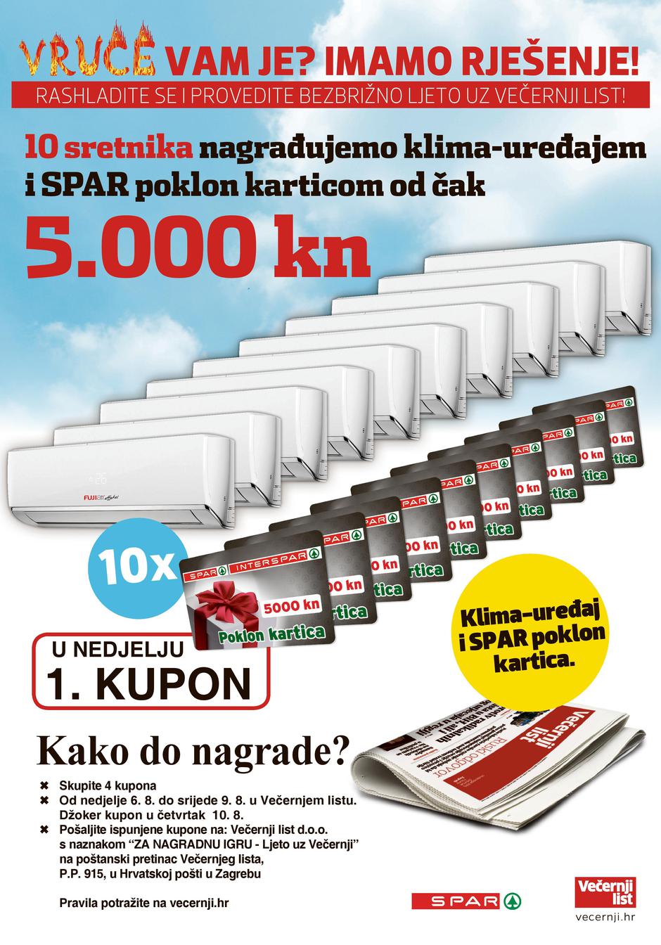 Sve što trebate napraviti kako biste osvojili klima-uređaj i Spar poklon karticu jest skupiti 4 kupona u razdoblju od 6. do 9. kolovoza. Prvi kupon izlazi 6. kolovoza, zato požurite po svoj primjerak Večernjeg lista i osigurajte si osvježenje uz bezbrižno ljeto - idealnim rješenjem za ljetne vrućine! A 10. kolovoza bit će objavljen i džoker kupon, ako ste slučajno propustili jedan od prethodnih kupona.