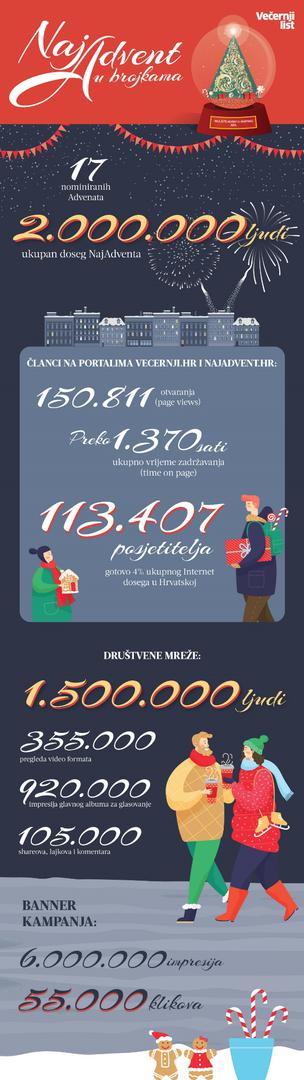 Velik interes publike za novi projekt Večernjeg lista potvrđuju izvrsne statistike čitanosti i pregleda svih adventskih sadržaja nominiranih gradova. Članci na portalu Vecernji.hr i stranici Najadvent.hr imali su 150.811 otvaranja (page views) i ukupno vrijeme zadržavanja (time on page) preko 1.370 sati te ostvarili doseg od 113.407 posjetitelja (users), što je gotovo 4% ukupnog Internet dosega u Hrvatskoj.