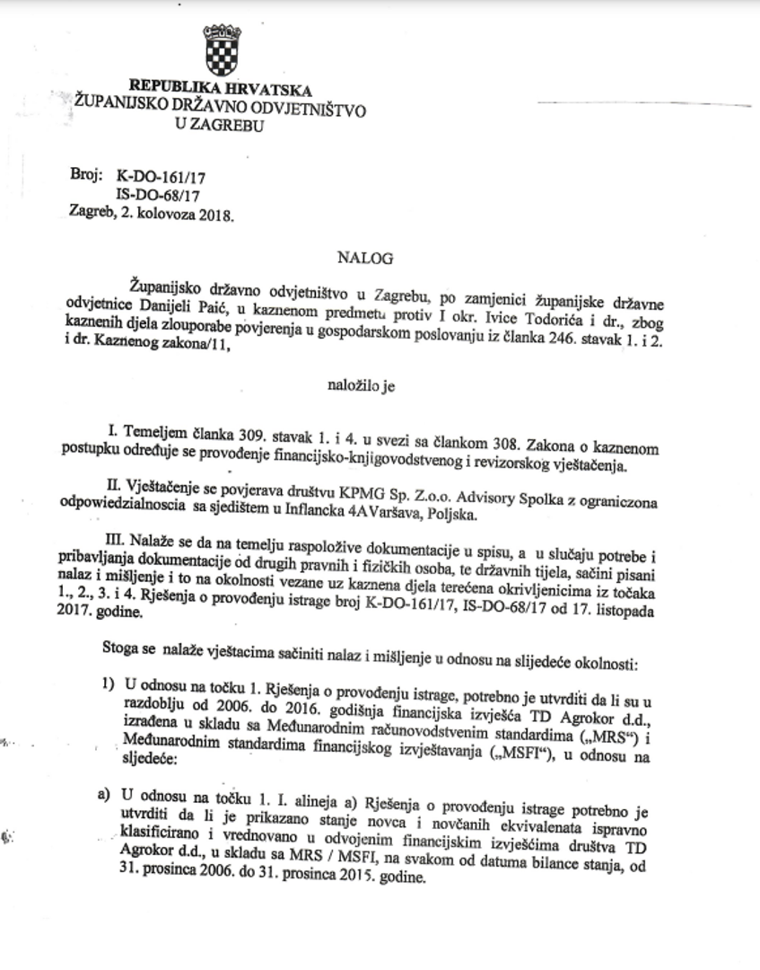 Županijsko državno odvjetništvo u Zagrebu 2. kolovoza 2018. godine izdalo je Nalog za vještačenje tvrtki KPMG iz Poljske tražeći od te tvrtke koja je specijalizirana za financijske analize - izradu knjigovodstvenog i revizorskog vještačenja u tadašnjem Agrokoru.