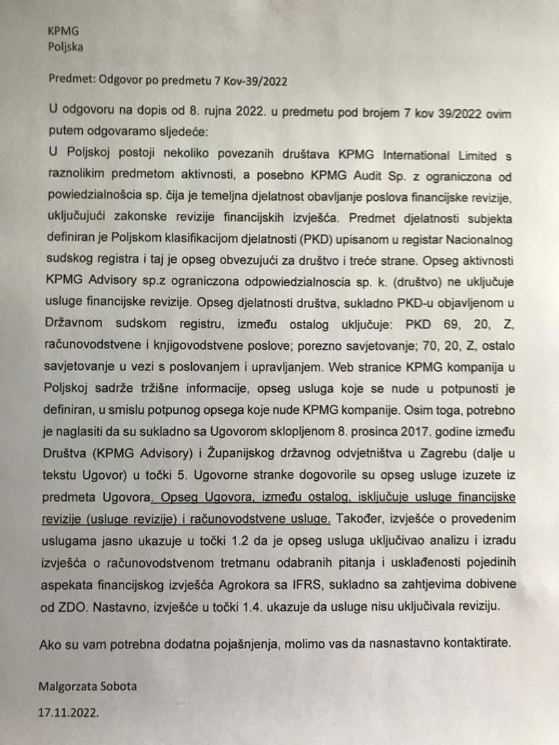 KPMG je odgovorio, između ostalog, kako slijedi: "Opseg ugovora između društva KPMG i DORH-a isključuje usluge financijske revizije i računovodstvene usluge".