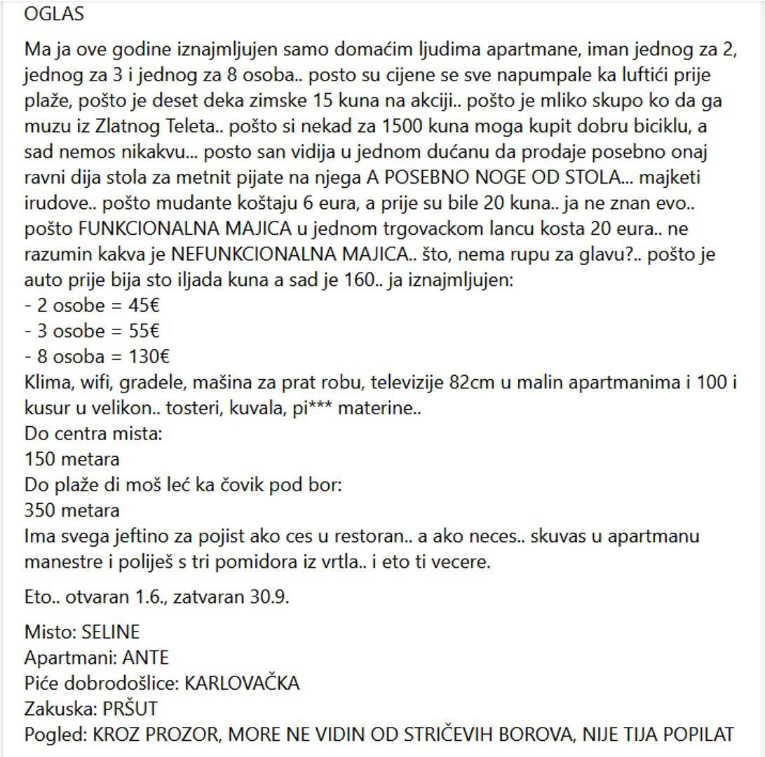 Zanimljiv oglas osvanuo je u Facebook grupi Apartmani Hrvatska gdje je jedan Dalmatinac odlučio svoje apartmane iznajmljivati samo Hrvatima i to po puno povoljnijim cijenama nego što su trenutačno na tržištu. Oglas prenosimo u cijelosti:
