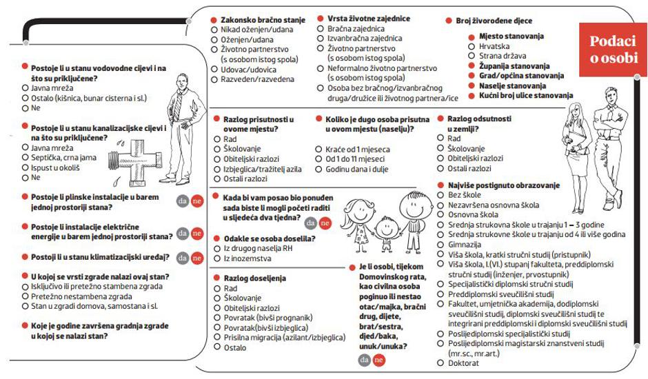 Građane će se pitati o državljanstvu, vjeri, materinskom jeziku, narodnosti, obrazovanju, mjestu rođenja, ima li hrvatsko ili uz njega i drugo državljanstvo ili strano. Odgovarat će i jesu li im glavni izvori sredstava za život u proteklih godinu dana prihodi od rada ili imovine, mirovina, socijalne naknade, ostali prihodi ili su bez prihoda... Kako smo informirani da demografi, osobito istaknuti, nisu sudjelovali u izradi upitnika, iz Državnog zavoda za statistiku su nam odgovorili da su, vezano za sadržaj pitanja u popisnom upitniku, proveli konzultacije s 49 institucija i državnih tijela, da su zatražena mišljenja od Katedre za demografiju Ekonomskog fakulteta u Zagrebu, Geografskog odsjeka PMF-a u Zagrebu, Instituta za migracije i narodnosti, Odjela za sociologiju Hrvatskoga katoličkog sveučilišta i Filozofskog fakulteta u Zagrebu, Katedre za socijalnu politiku Pravnog fakulteta u Zagrebu, Odjela za geografiju Sveučilišta u Zadru, Građevinskog fakulteta u Zagrebu, Ekonomskog instituta Zagreb i Instituta za javne financije.