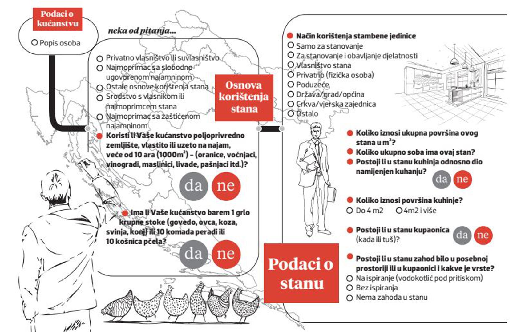“Ima li vaše kućanstvo barem 1 grlo krupne stoke (govedo, ovca, koza, svinja, konj) ili 10 komada peradi ili 10 košnica pčela?” To je jedno od pitanja iz popisnog upitnika 2021. godine koje će popunjavati građani tijekom popisa stanovništva, kućanstava i stanova, koji bi trebao početi u rujnu. No, u upitniku nema pitanja o broju nekretnina u vlasništvu osobe ili kućanstva!