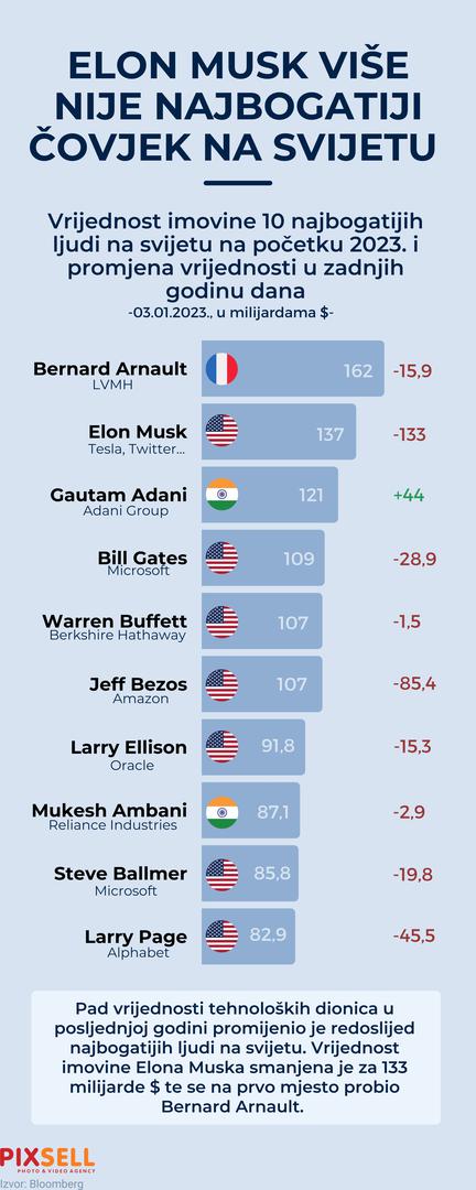 Infografika prikazuje vrijednost imovine deset najbogatijih ljudi na svijetu na pocetku 2023. godine. Tako je najbogatija osoba Bernard Arnault, a slijede ga Elon Musk i Gautam Adani. Photo: Marko Picek/PIXSELL