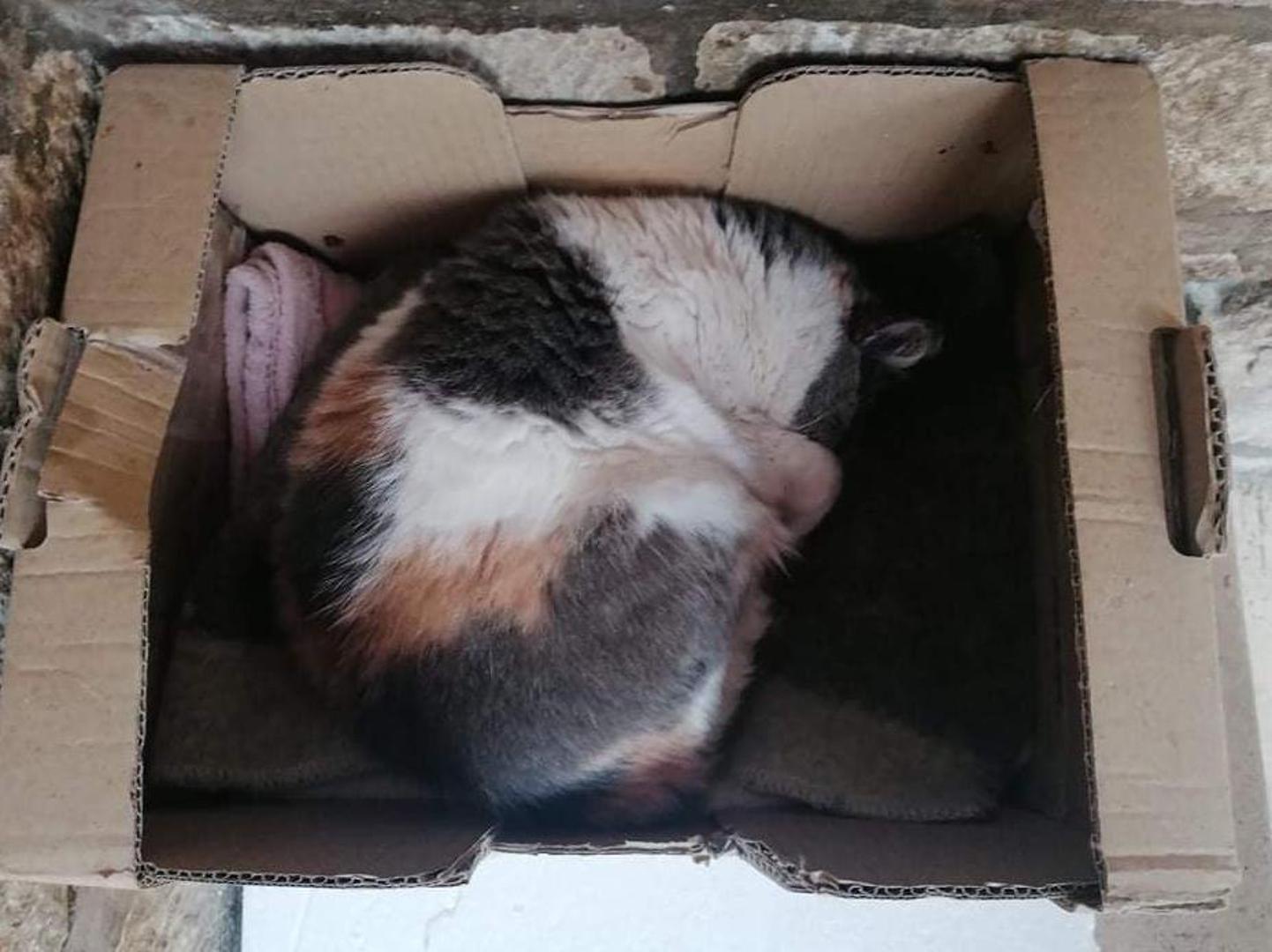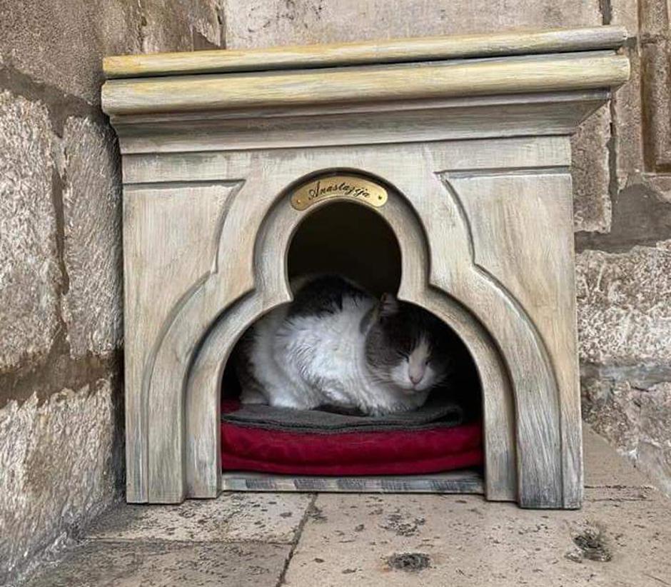 Drvena kućica izgledom se uklopila u vizuru građevine, a njezin kreator kaže da nije više mogao gledati kako maca koja broji već 18 godina spava na kamenu, na suncu, vjetru, kiši i hladnoći.