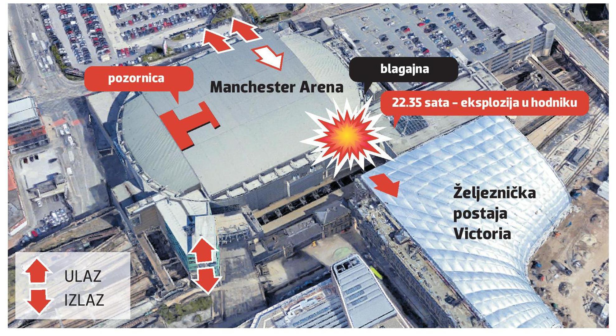 Najmanje dvadeset i dvoje ubijenih i šezdesetak ranjenih – stravična je to bilanca eksplozije koja je u ponedjeljak pred ponoć odjeknula u predvorju Manchester Arene, odmah po završetku koncerta američke pop zvijezde Ariane Grande. Bombaš samoubojica detonirao je eksploziv u trenutku dok je publika, mahom mlade djevojke i mladići, izlazila iz dvorane, dok je predvorje bilo puno. Bomba kućne izrade bila je napunjena čavlima, komadima žice i metala kako bi udar i krhotine nanijele što veće razaranje i poubijale što je moguće više nedužnih posjetitelja.