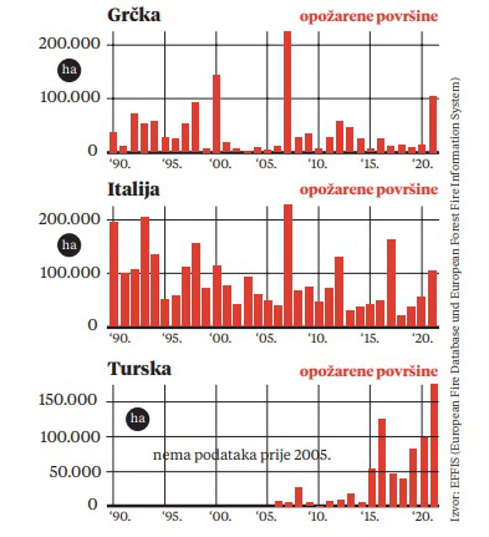 Na svim tim prostorima dugotrajne ekstremne temperature i suša, ali i neodgovorno ponašanje pojedinaca, stvaraju idealne uvjete za širenje požara. Ono što posebno zabrinjava su najave znanstvenika kako će zbog klimatskih promjena takvi vremenski uvjeti biti sve učestaliji i vjerojatno razorniji. Spaljena područja u požarima ove godine su već sada znatno veća od onih iz prethodnih godina. Do sada je u pet najvećih južnoeuropskih zemalja (Portugal, Španjolska, Italija, Grčka i Turska) ukupno izgorjelo 440.000 hektara. Riječ je o ogromnim površinama, ali se one neće, barem se tako svi nadaju, približiti 2007. godini kada su požari pričinili još veću štetu. U 2007. koja se i dalje smatra rekordnom kada je riječ o broju požara, spaljenoj površini i stradalima. Ipak, tekuća 2021. godina već je sada najgora požarna sezona od 2007. godine.