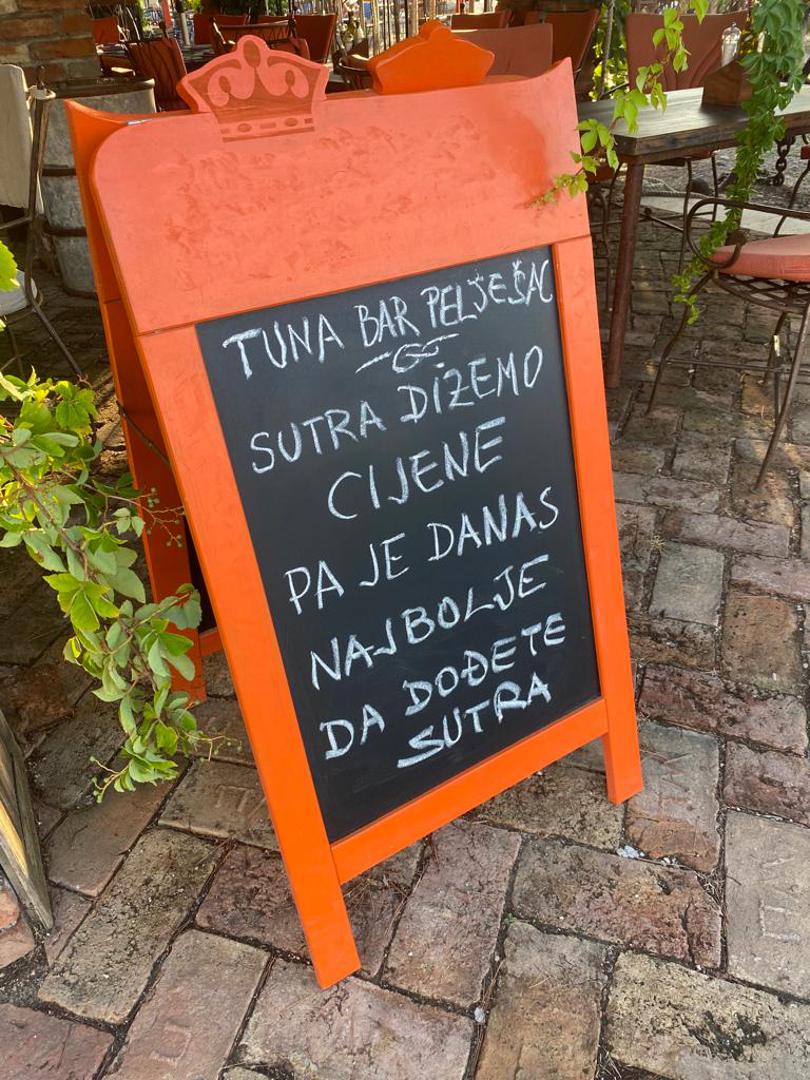 Namjernici su tako pred njegovim barom mogli pročitati: 'Imamo odličnog kuhara, ali ga ne bismo preporučili', 'Akcija! Punjene paprike, platiš 3, dobiješ 2', 'Pola litre isto kao litra!', 'Smanjili smo porcije, ali smo zato poskupili', 'Jedan konobar, kuhara nema... Možemo vam naplatiti jedino što sami skuhate'. Duhoviti pelješki ugostitelj sprdao se i na račun kvalitete u svom restoranu: 'Ako ste nezadovoljni, dođite nam opet da potvrdite da ste bili u pravu' i slično. Ovog ljeta, pak, tabla ispred restorana, aludirajući na Inu i mađarsko vlasništvo, neko je vrijeme obavještavala i da su u toku 'Dani mađarske kužine', ali i da bi vlasnik manjak konobarskog kadra rado pojačao s nekim političarima iz okruženja.