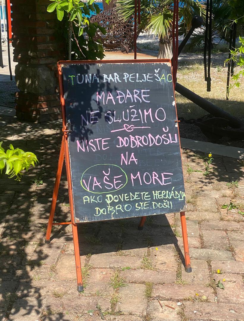 Zbog 'nedobrodošlice' Mađarima pelješki ugostitelj s tridesetogodišnjim iskustvom osumnjičen je, inače, za povredu dostojanstva Mađara po Zakonu o suzbijanju diskriminacije. Nekoliko riječi ispisanih kredom mogla bi ga tako kao fizičku osobu stajati od pet do 30.000 kuna kazne ili, bude li u prijavi tretiran kao obrtnik, odnosno pravna osoba, od deset do čak 200.000 kuna. Poziv na sud još nije dobio iako je od posjeta policije prošlo nekoliko mjeseci.