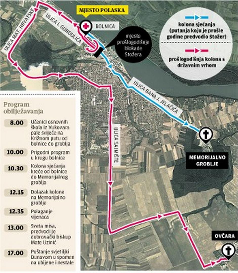 Službeni program, inače, odavno je spreman. Sutrašnji dan započinju, paljenjem svijeća, vukovarski učenici na cijeloj dužini Križnoga puta od bolnice do Memorijalnog groblja. Prigodni program započinje u krugu vukovarske bolnice, poslije čega kreće kolona sjećanja koju ove godine predvode pripadnici 4. bojne 3. gardijske brigade zajedno s pripadnicima 204. vukovarske brigade i braniteljskim udrugama grada Vukovara. Programom je predviđeno da podno spomen-obilježja na Memorijalnom groblju bude položeno osam vijenaca u sklopu službenoga protokola. Potom slijedi sveta misa za sve pokojne i nestale koju će predvoditi dubrovački biskup mons. Mate Uzinić.