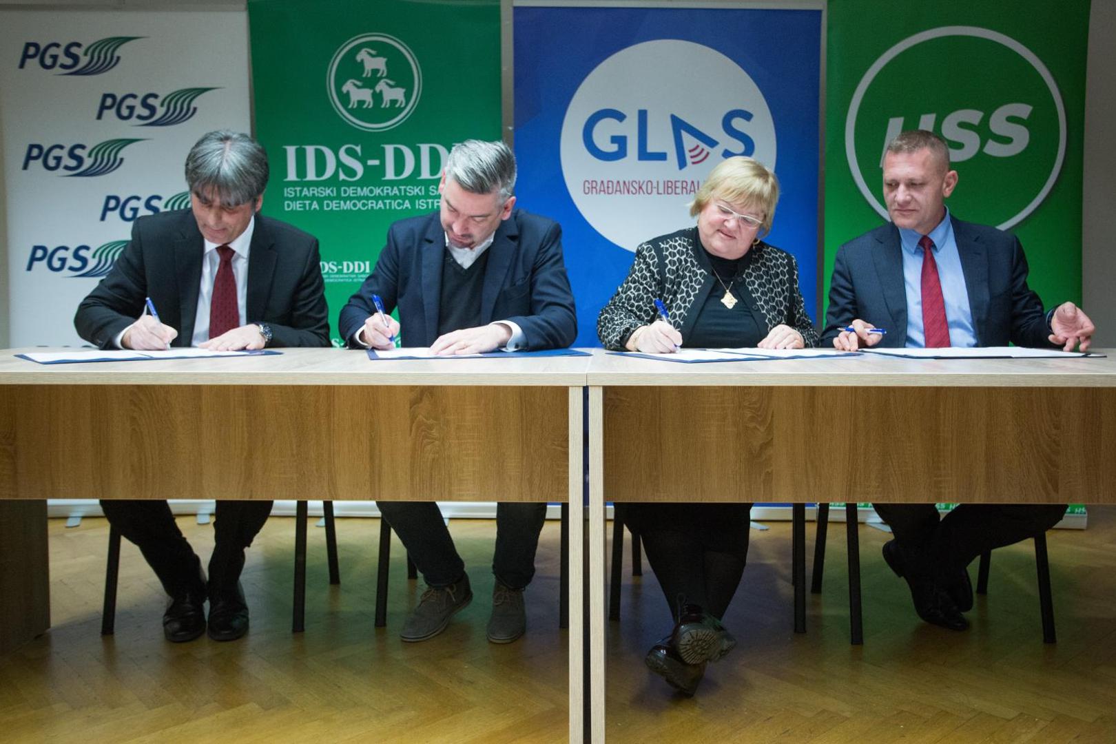 Predsjednici GLAS-a Anka Mrak Taritaš, IDS-a Boris MIletić, HSS-a Krešo Beljak i PGS-a Darijo Vasilić danas su u Rijeci potpisali sporazum o pristupanju PGS-a u Amsterdamsku koaliciju.