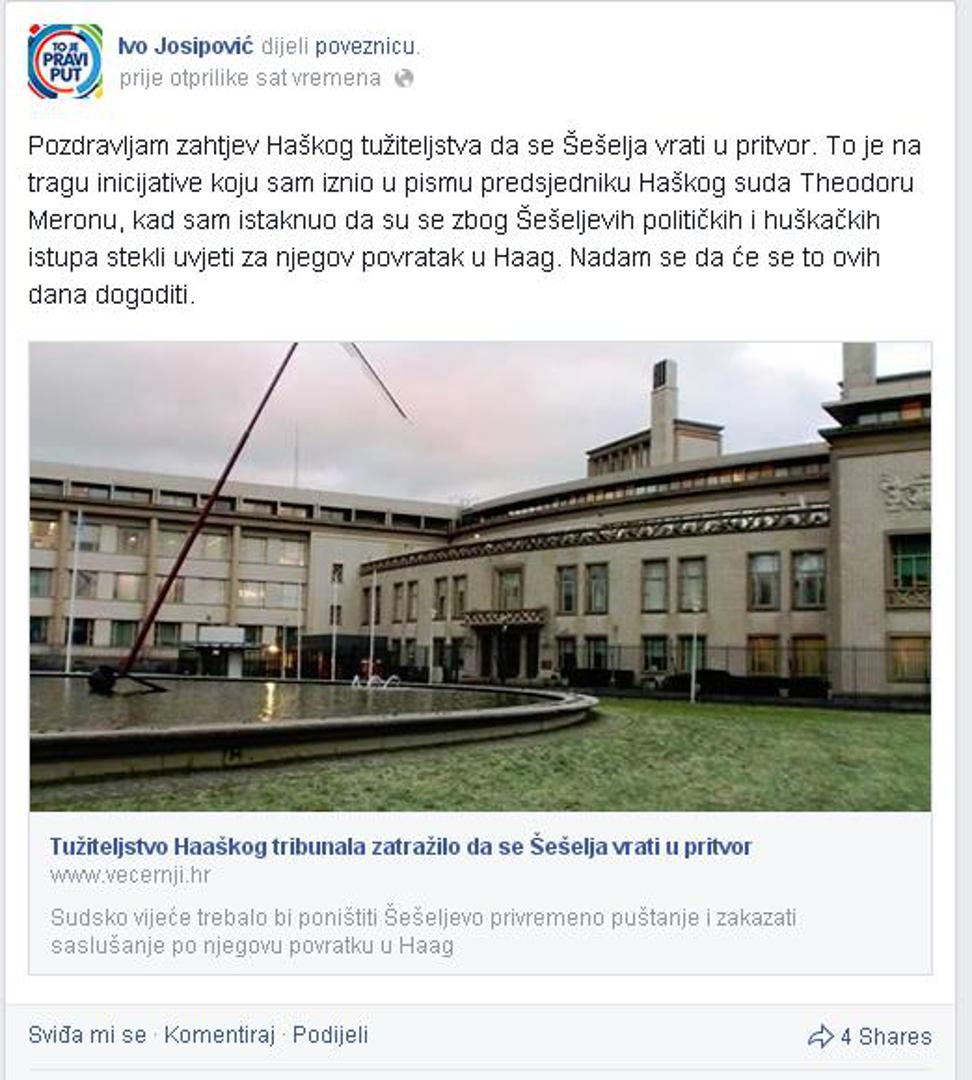 - Pozdravljam zahtjev Haaškog tužiteljstva da se Šešelja vrati u pritvor. To je na tragu inicijative koju sam iznio u pismu predsjedniku Haškog suda Theodoru Meronu, kad sam istaknuo da su se zbog Šešeljevih političkih i huškačkih istupa stekli uvjeti za njegov povratak u Haag. Nadam se da će se to ovih dana dogoditi - napisao je Josipović na svom Facebook-profilu gdje je i stavio poveznicu na vijest koju je objavio naš portal.