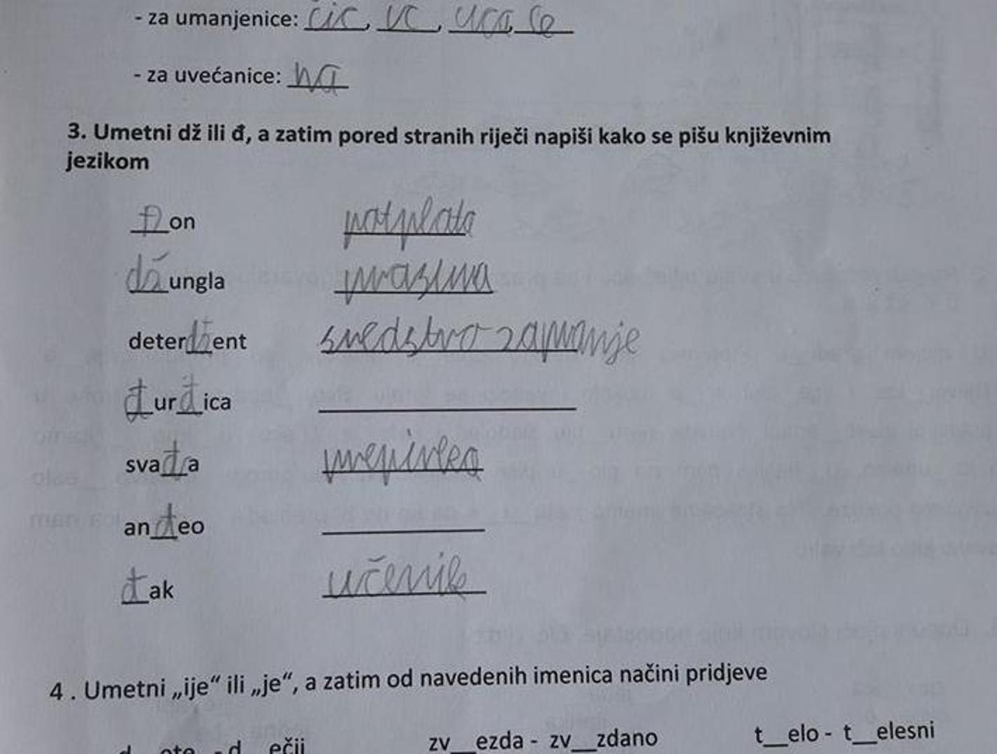 Zbog početka nove školske godine prisjetili smo se jednog viralnog testa koji je prije nekoliko godina izazvao podijeljena mišljenja. Naime, jedna majka poslala nam je fotografiju testa za 4. razred osnovne škole u kojemu se od učenika traži da u riječi umetnu dž ili đ te uz strane riječi napišu kako se pišu književnim jezikom.