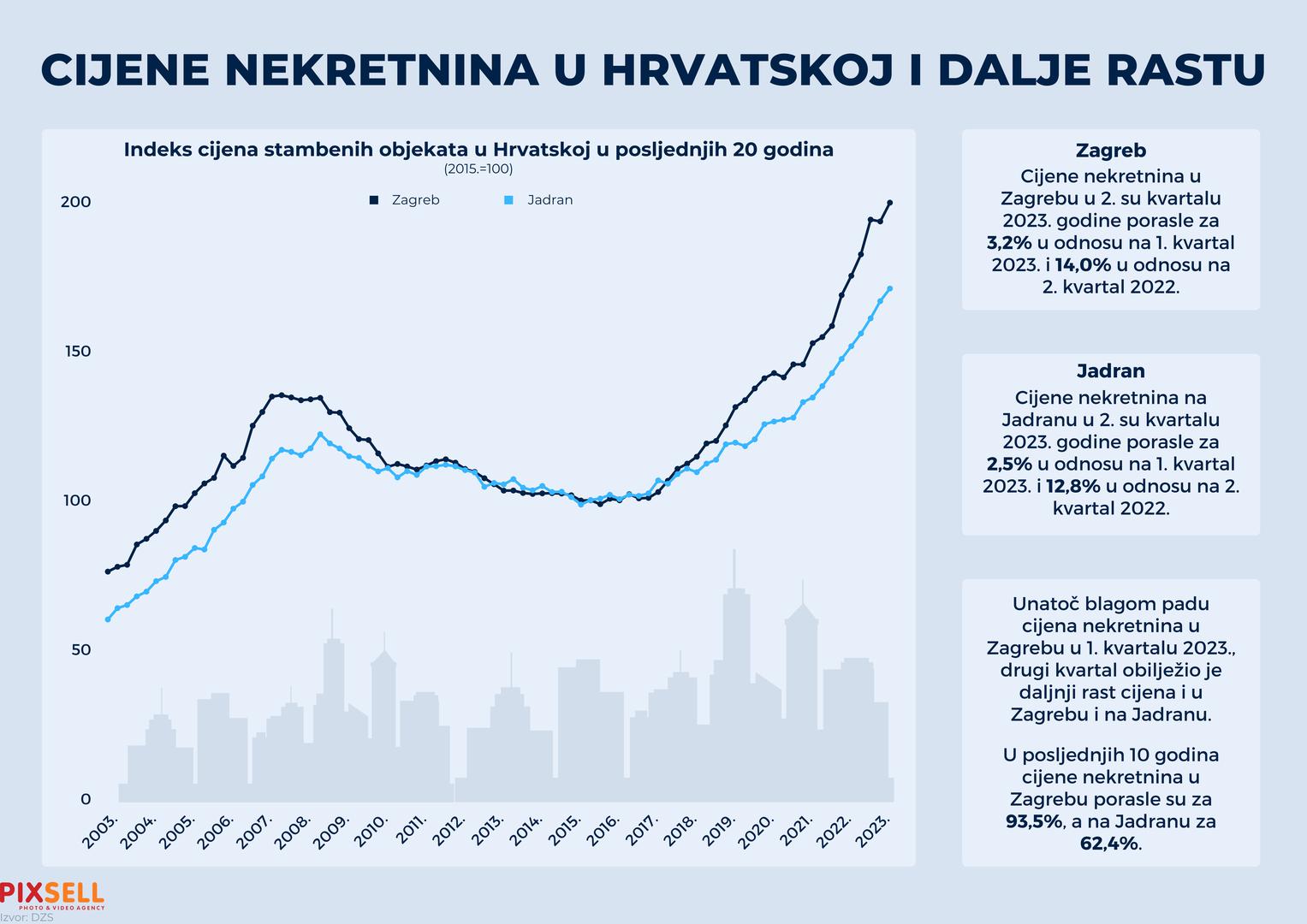Infografika prikazuje da cijene nekretnina u Hrvatskoj i dalje rastu.Tako su cijene nekretnina u Zagrebu u 2. kvartalu 2023. godine porasle za 3,2% u odnosu na 1. kvartal 2023. i 14,0% u odnosu na 2. kvratal 2022. Photo: Marko Picek/PIXSELL