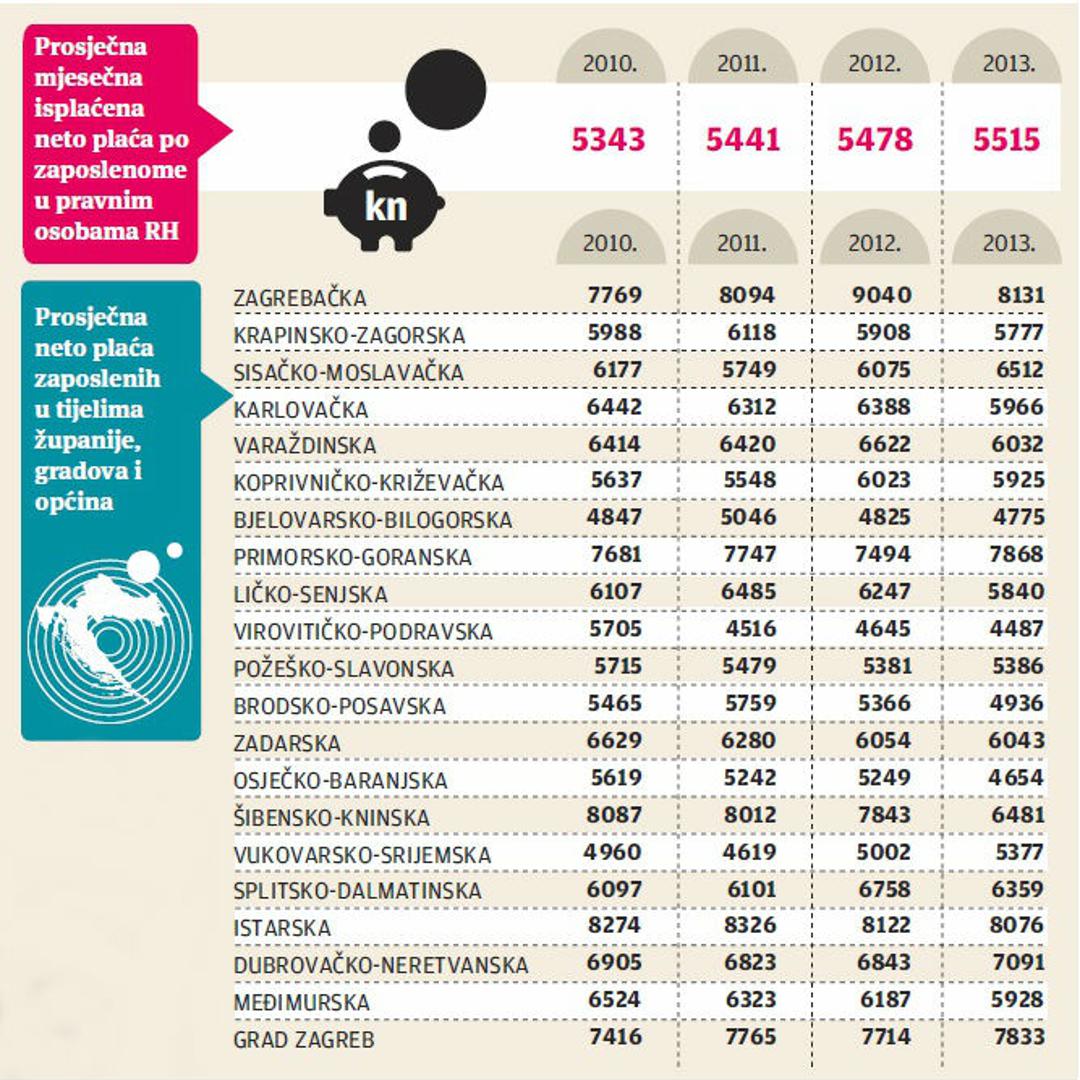 Najniže plaće imaju Podravci (4487 kn) i Bilogorci, a kretanje u četiri godine pokazuje da su neki, poput vlasti unutar Šibensko-kninske županije, rezali plaće sa 8 na 6,5 tisuća kuna.