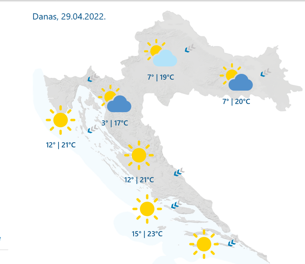 Vjetar će biti povremeno umjeren sjeverni i sjeveroistočni, a temperatura zraka ujutro oko 7, poslijepodne 19 - 20 °C.