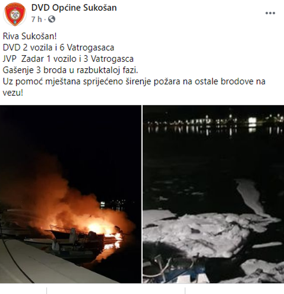 Noćas oko 1.00 sat policija je zaprimila dojavu kako je u Sukošanu, na mjesnoj rivi, izbio požar na jednom plovilu. Požar su ugasili vatrogasci oko 1.45, a u požaru su zahvaćena i druga dva plovila. Ozlijeđenih osoba nije bilo.