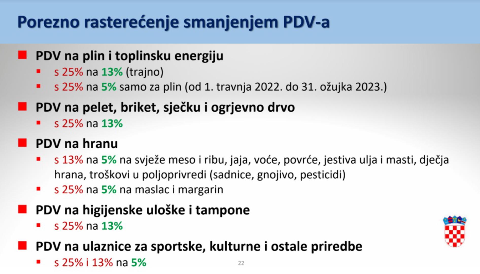 PDV će se trajno sniziti s 25 posto na 13 posto na plin i toplinsku energiju, izjednačit će se PDV na plin, struju i toplinsku energiju. Smanjujemo PDV na plin s 25 na 5 posto od 1. travnja 2022. do 1. ožujka 2023. PDV na palete, briket, sječku i ogrjevno drvo spuštamo s 25 na 13 posto. Da bismo olakšali našim građanima, idemo i sa smanjenjem stope PDV-a na hranu. Sada s postojeće stope od 13 posto na svježe meso, ribu, jaja, voće, povrće, jestiva ulja i masti, dječju hranu, troškove u poljoprivredu, spuštamo s 13 na 5 posto. Dodatno ulazimo i u dio mliječnih proizvoda, smanjujemo s 25 na 5 posto stopu na maslac i margarin. Smanjujemo stopu PDV-a i na higijenske uloške i tampone s 25 na 13 posto. Smanjuje se i ulaznice za sportske, kulturne priredbe s 25 na 5 posto – kazao je Plenković.