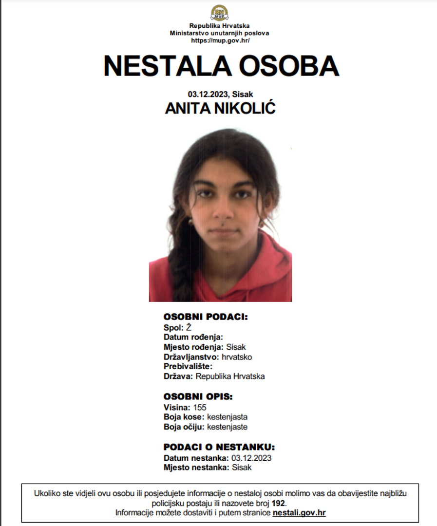 Sisačka policija objavila je kako se traga za djevojkom čiji je nestanak prijavljen dana 3. prosinca 2023. godine kada se udaljila iz svog doma na sisačkom području i od kada joj se gubi svaki trag. Djevojka je visoka 155 centimetara, ima kestenjastu kosu te kestenjaste oči. Također ima madež između nosa i gornje usnice te je slabe tjelesne razvijenosti.