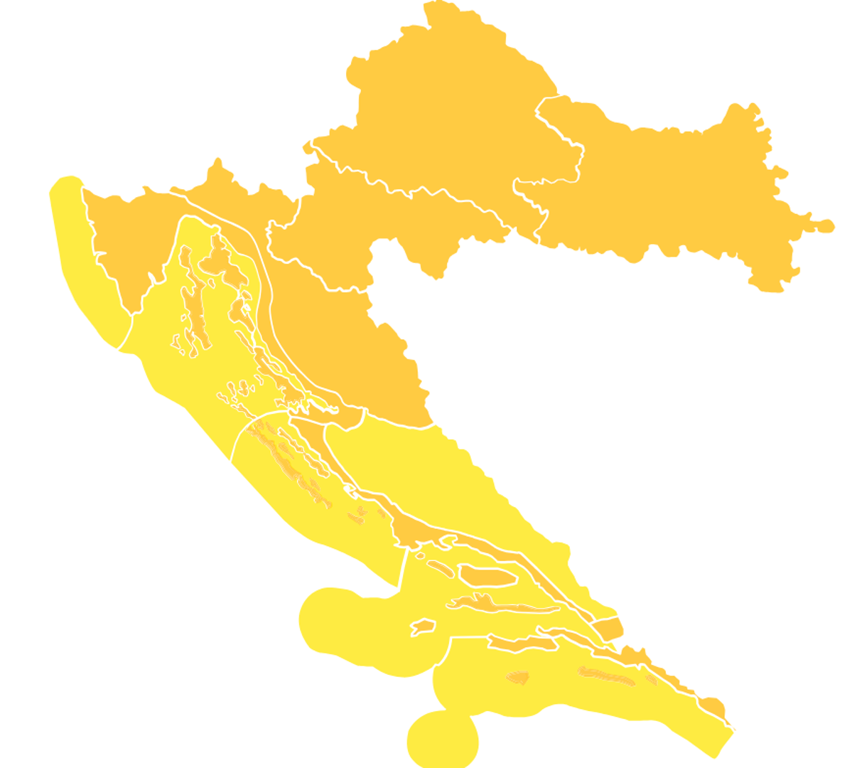 Osim tri spomenute regije, upozorenja postoje i za sve osim osječke. Naime, žuto upozorenje izdano je zbog grmljavinskog nevremena za karlovačku, gospićku i riječku regiju. Zbog vjetra je izdano za zapadnu obalu Istre, Kvarner i Kvarnerić te sjevernu i srednju Dalmaciju. Žutim upozorenjem označena je i kninska regija zbog iznimno visoke temperature.