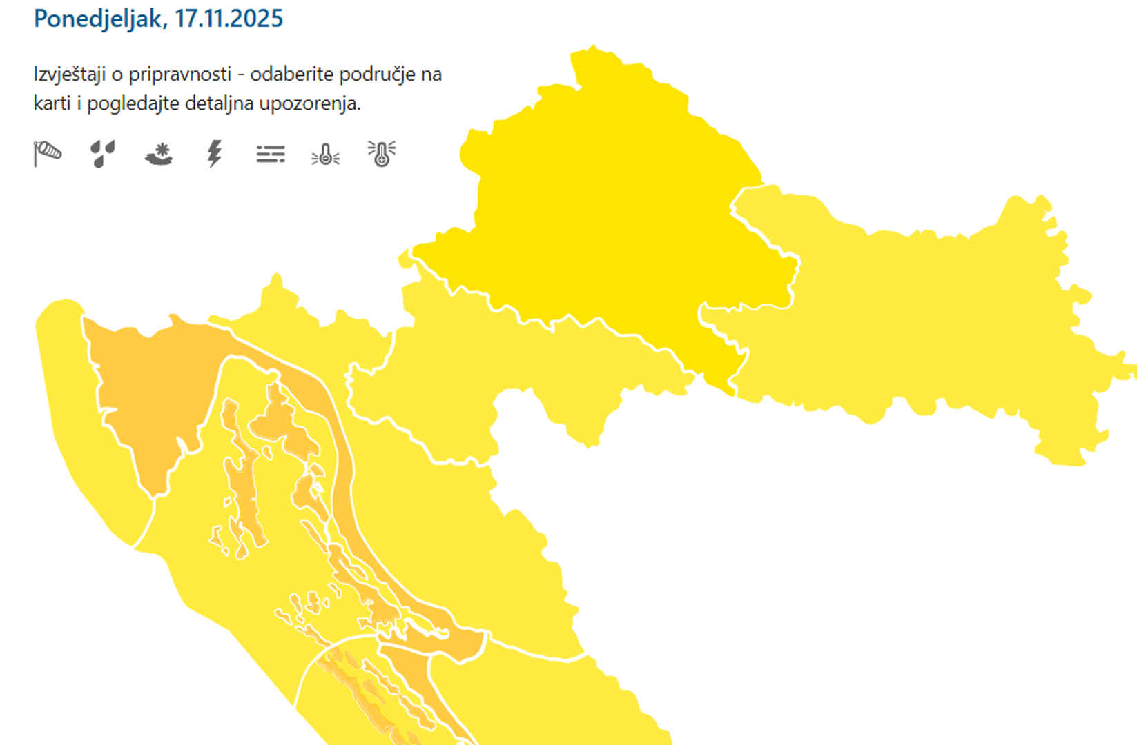 Izdana su upozorenje za cijelu zemlju. "Budite na oprezu zbog mogućih jačih grmljavinskih nevremena. Posebno pripazite u izloženim područjima kao što su planine, šume i livade odnosno otvoreni tereni. Mogući su prekidi u aktivnostima na otvorenom", upozorava DHMZ. Za riječku i splitsku regiju izdan je narančasti meteoalarm.