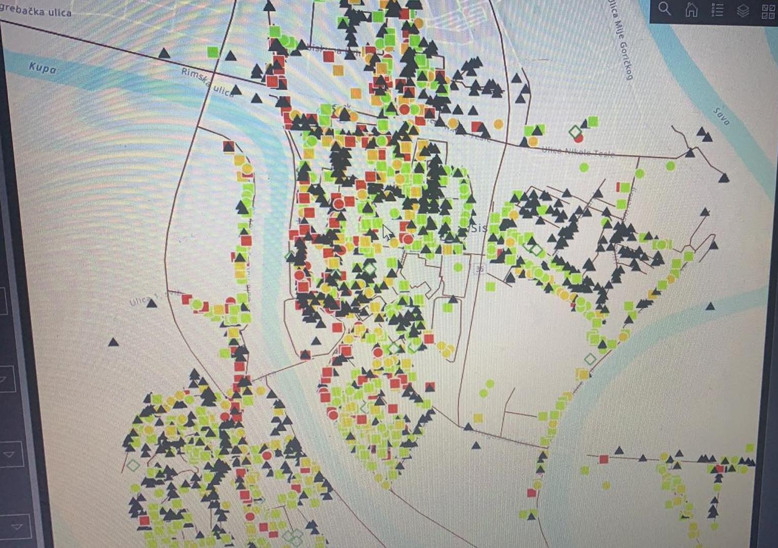 Večernji list je dobio i grafički prikaz sa aplikacije koju koriste statičari i hitne službe, a koja prikazuje oznake oštećenih objekata u Sisku i Petrinji. Iz njih se vidi kako je naročito stradao onaj stari dio gradova, sama središta.