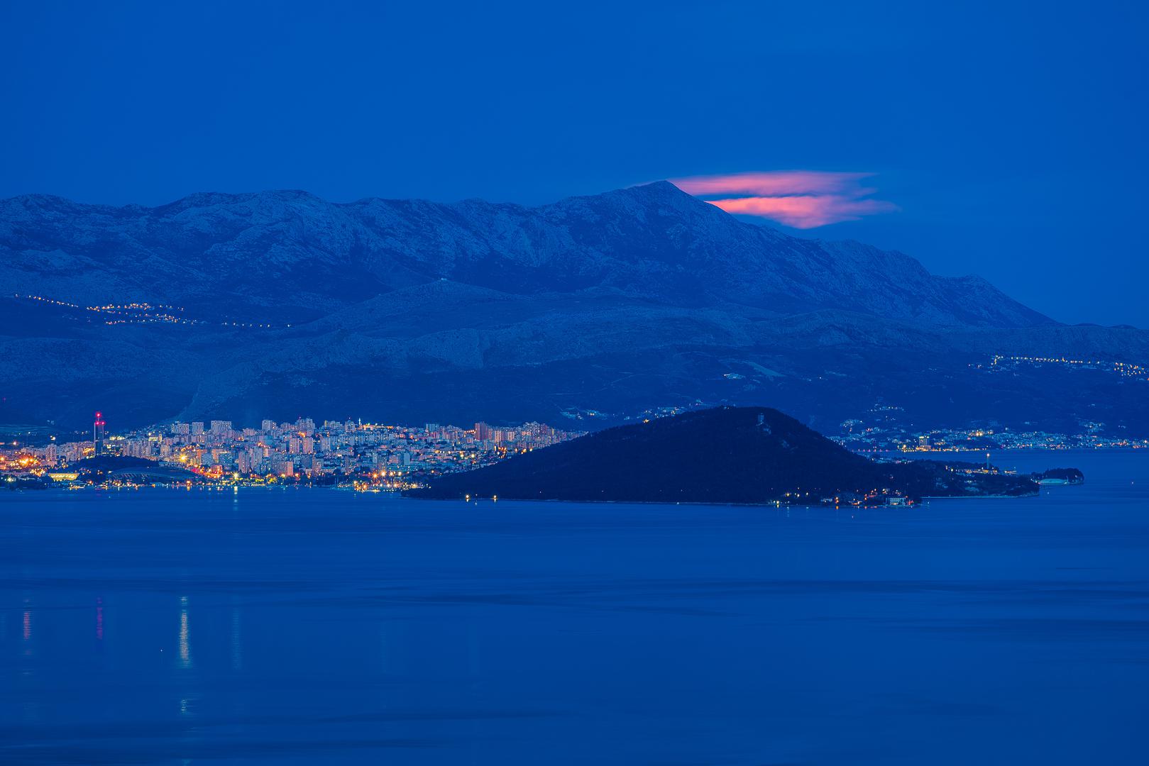 Pogled je zabilježen iz Segeta Donjeg, a objektiv je uhvatio izlazak Mjeseca iznad planine Mosor i pogled na Marjan i Split.