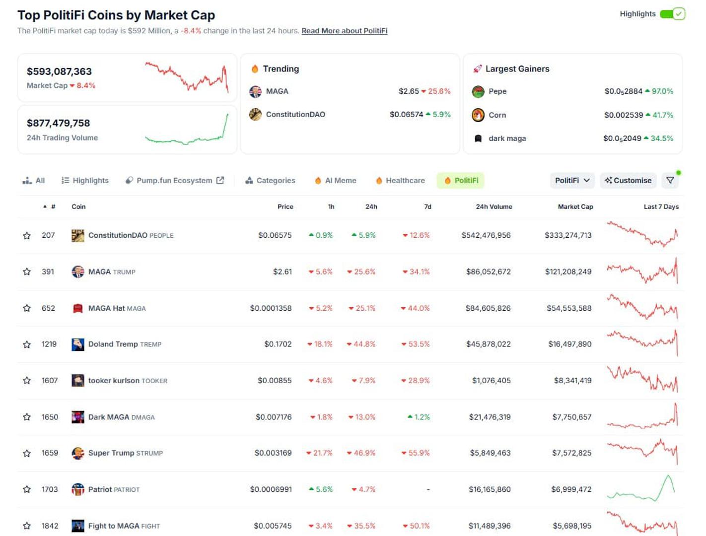 PolitiFi meme coini zabilježili su u ponedjeljak značajan rast na početku izbornog tjedna, a do utorka su održale ukupni porast od 0,6%.