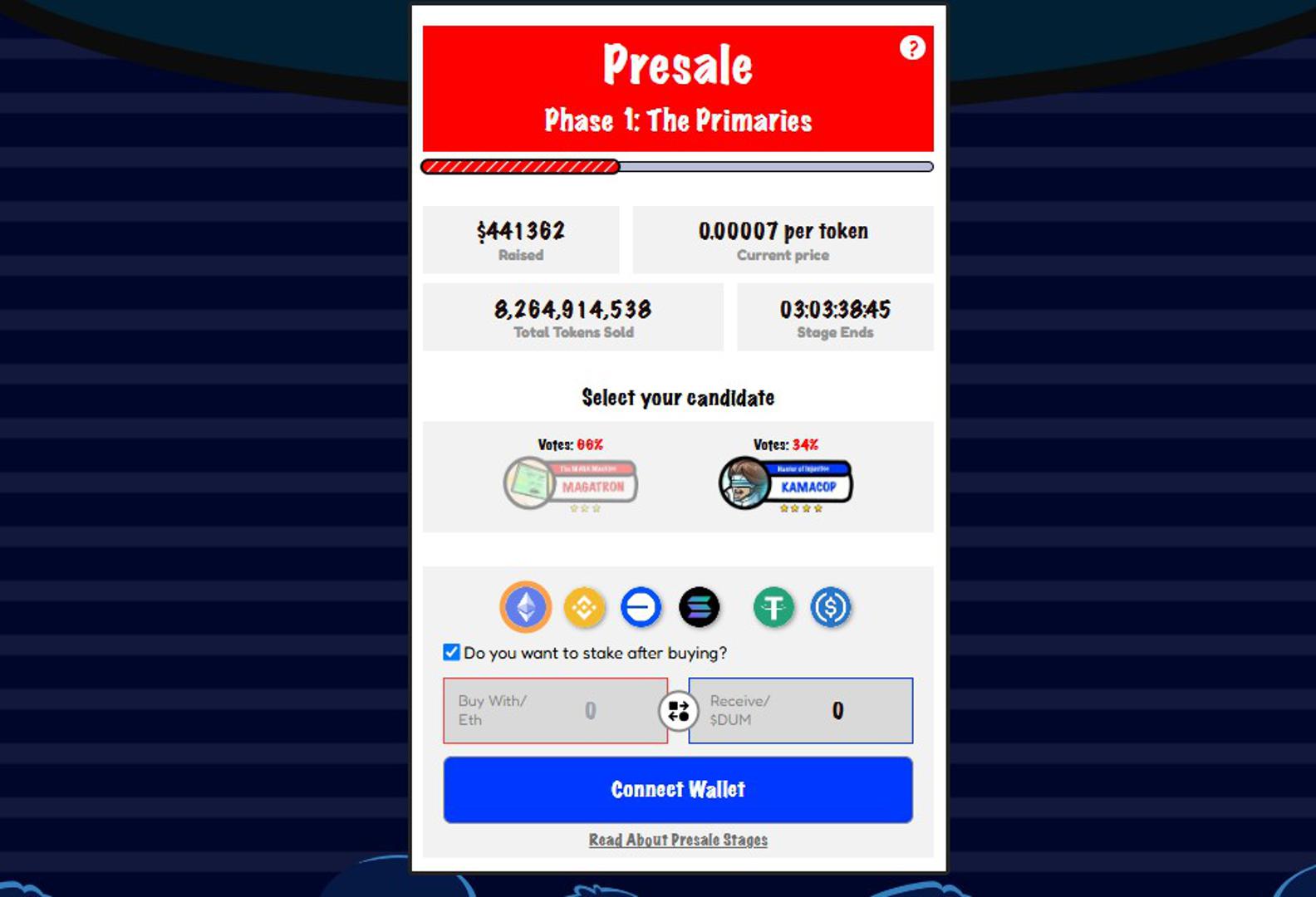 Ovaj projekt podržava više blockchain mreža. Stoga možete kupiti $DUM koristeći Ethereum, Binance Smart Chain, Base ili Solanu. Prihvaćaju se i različite opcije plaćanja, uključujući ETH, BSC, BASE, SOL, USDT ili USDC.