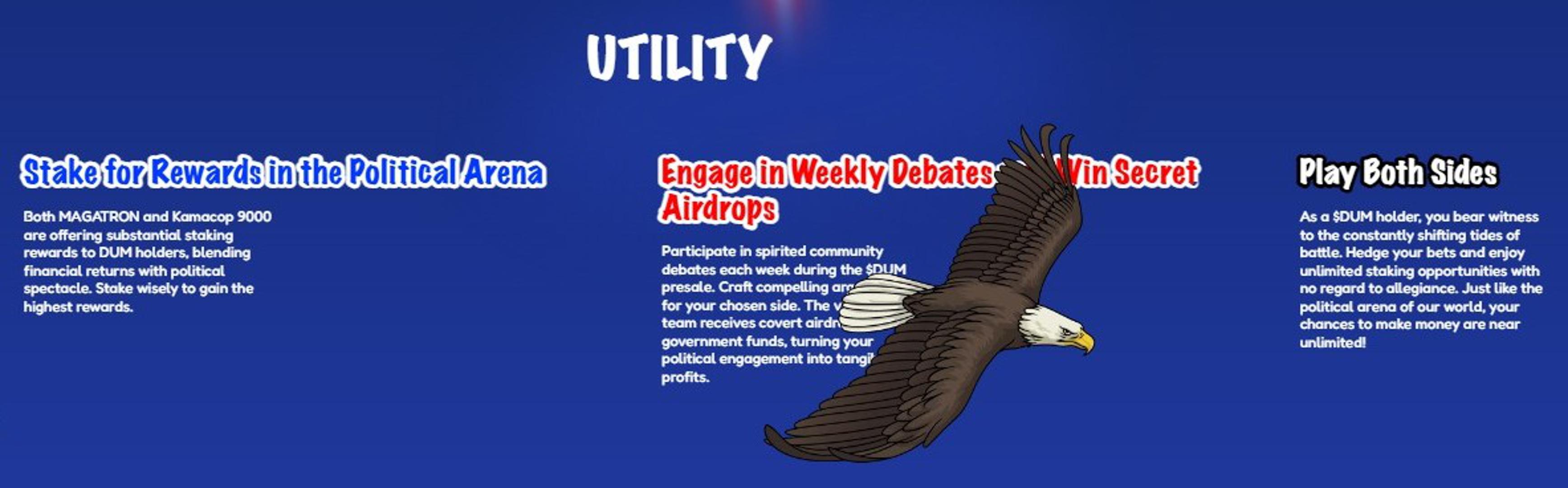 Zainteresirani sudionici mogu odabrati svoju stranu i "glasovati" putem izvornog $DUM tokena, čime izražavaju svoj kripto politički stav.