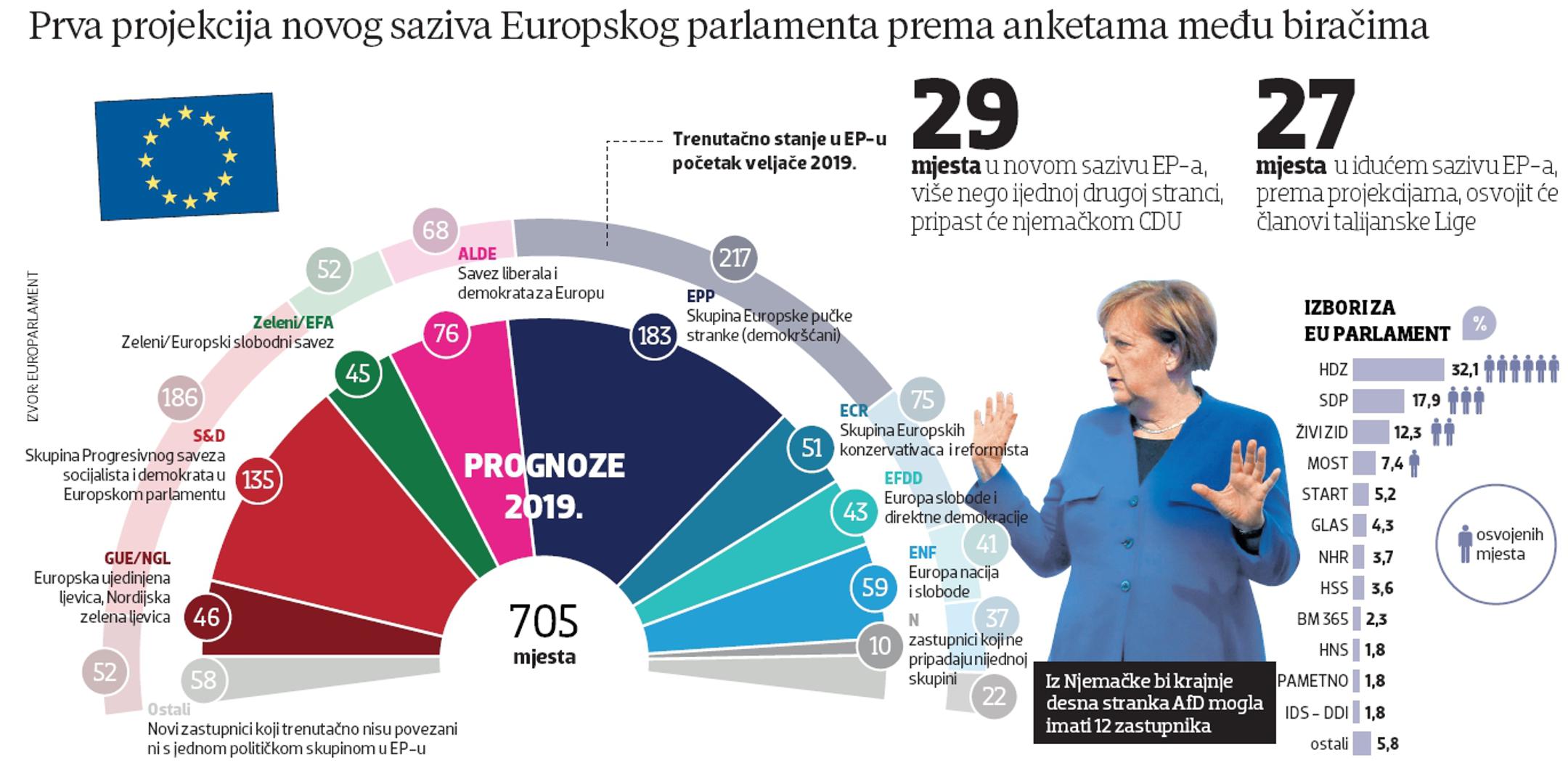 Prva projekcija novog saziva Europskog parlamenta, načinjena prema trenutačnom raspoloženju birača u EU izmjerenog u anketama početkom veljače, pokazuje da će europski pučani ostati najsnažnija grupacija, ali i pasti s trenutačnih 217 na 183 mjesta, da će ojačati anti-EU populisti poput stranke Liga u Italiji, a u hrvatskim okvirima ta projekcija predviđa da bi HDZ mogao osvojiti 6, SDP 3, Živi zid 2 i Most 1 mandat.