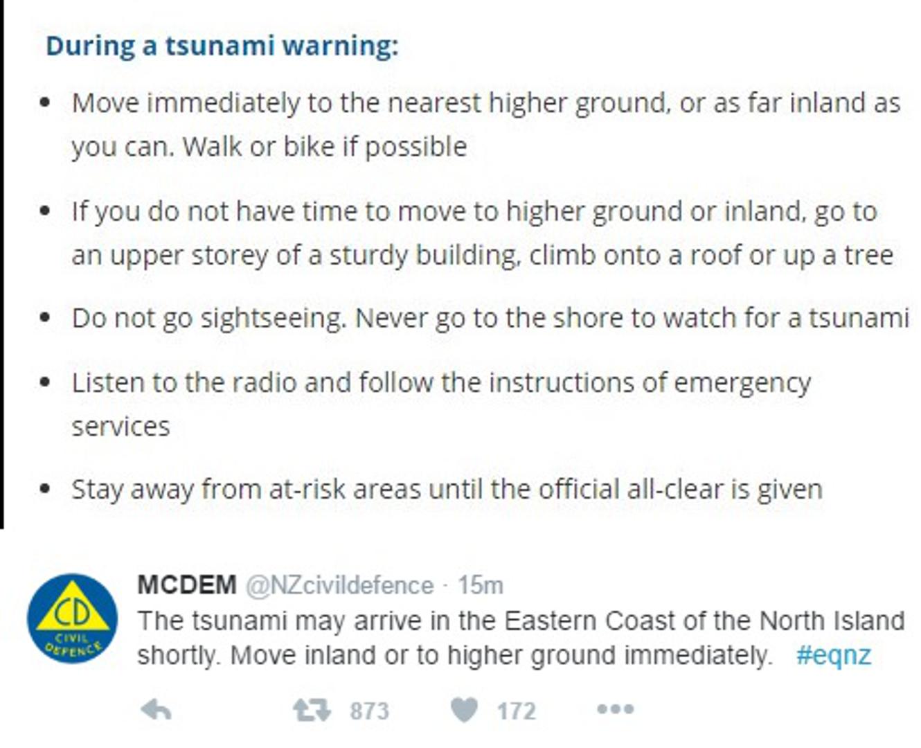 The tsunami may arrive in the Eastern Coast of the North Island shortly. Move inland or to higher ground immediately. #eqnz pic.twitter.com/9FaXKunsps