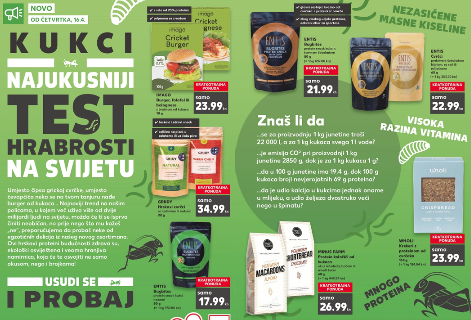 - Umjesto čipsa, grickaj cvrčke, umjesto ćevapčića neka se na tvom tanjuru nađe burger od kukaca... - istaknuli su iz Kauflanda i napomenuli kako je riječ o zdravim, ekološki osviještenim i veoma hranjivim namirnicama.