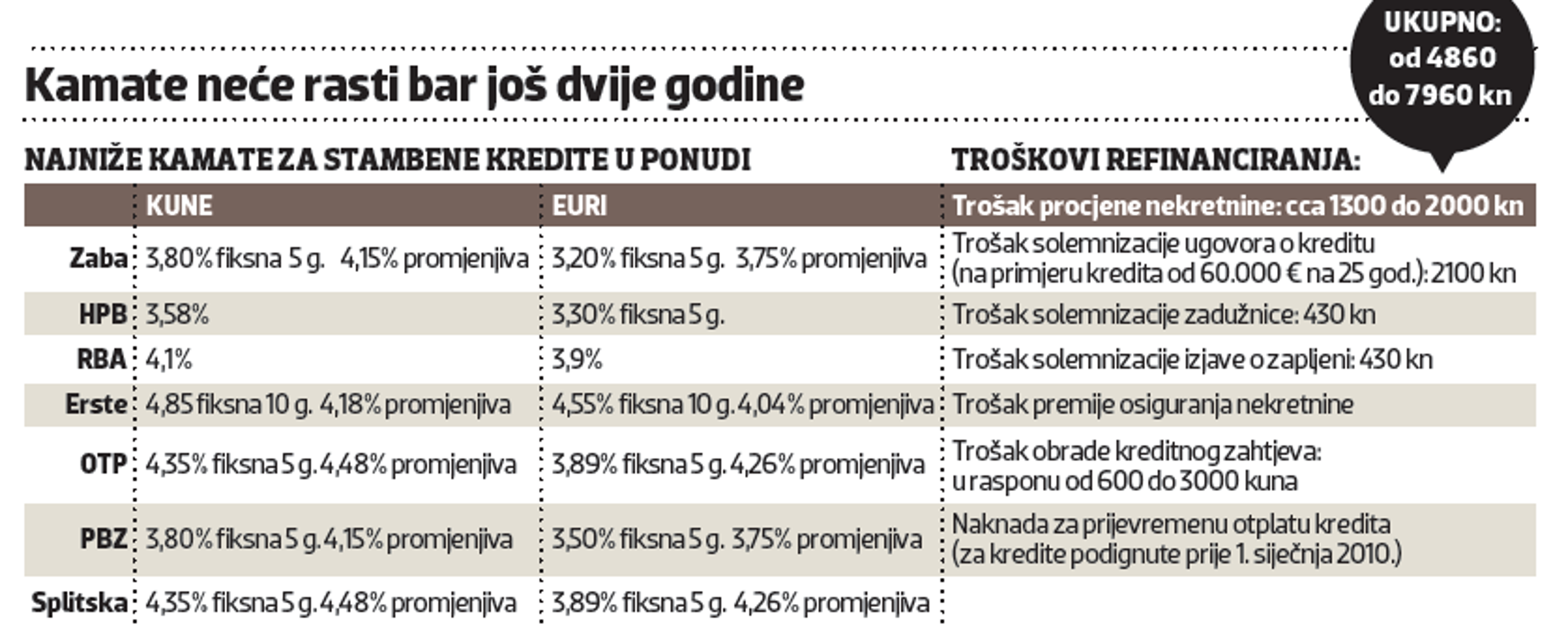 Zaba pak najavljuje posebnu ponudu za mlade do 45 godina s kojom će krenuti ovih dana – eurske kredite s kamatom od 3,20 posto, fiksnom pet godina i promjenjivom od 3,75% u ostatku otplate. Za kunske kredite kamata će biti 3,80 posto, također fiksna pet godina, nakon čega je promjenjiva 4,15 posto. Ovi će krediti biti u ponudi kratkotrajno, a osim za kupnju ili izgradnju nekretnine, namijenjeni su za refinanciranje stambenih kredita drugih banaka, bez naplate troškova obrade. Da bi preuzele kvalitetne klijente drugih banaka, banke su spremne spustiti kamate, ali i refinancirati kredit novim, jeftinijim. To, doduše, vuče i brojne popratne troškove. U izračunu kojim smo pobrojili sve stavke refinanciranja troškovi su za neki prosječan stambeni kredit od 60-ak tisuća eura od 4860 do 7960 kuna.
