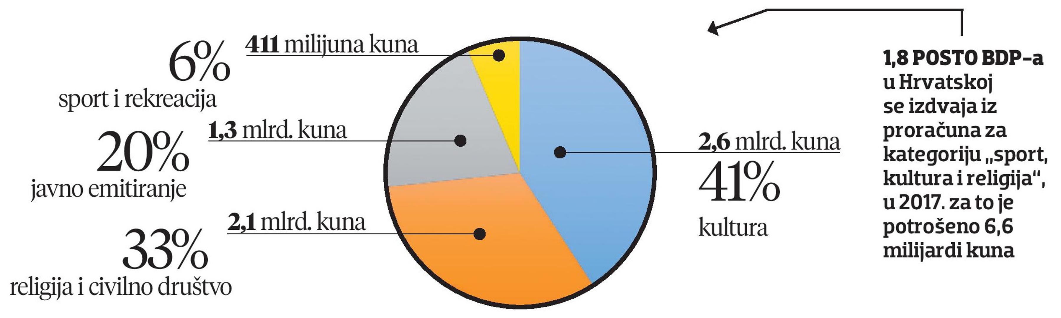 – Ovaj rast dohotka za grad koji ima 75.000 stanovnika (ekvivalent Zadra u Hrvatskoj) znači veću godišnju potrošnju od čak 2,5 milijuna eura – navodi Globan, analitičar MacroHuba. Globan podsjeća da Hrvatska izdvaja mnogo novca za proračunsku kategoriju "sport, kultura i religija" – 1,8 posto BDP-a, što nas svrstava na visoko treće mjesto u EU po izdvajanjima za tu stavku. Relativno govoreći, to je čak tri i pol puta više nego u Irskoj i 63 posto više od prosjeka EU. U 2017. godini, zadnjoj za koju postoje međunarodno usporedivi podaci, za sport, kulturu i religiju iz proračuna opće države potrošeno je 6,6 milijardi kuna. Proračun opće države uključuje budžete svih lokalnih jedinica, središnje države i proračunskih fondova.