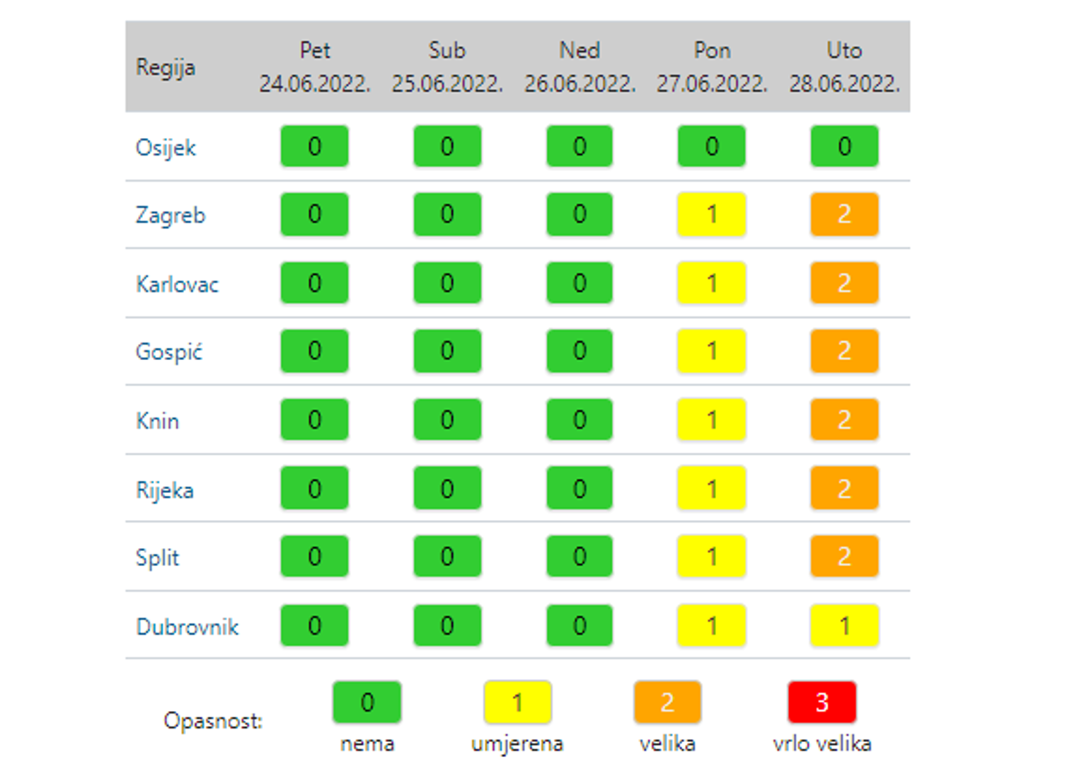 Istraživanje povezanosti između temperature zraka i smrtnosti, omogućilo je određivanje kritične temperature zraka za različite dijelove Hrvatske iznad koje se pojavljuje povećana opasnost od smrti, koja je potencirana u slučajevima kada ekstremna temperatura traje dulje vrijeme. Radi zaštite građana, uveden je sustav upozoravanja na opasnost od vrućine, koje se provodi u razdoblju od 15. svibnja do 15. rujna. Na temelju prognoze temperature zraka za danas i sljedeća četiri dana, DHMZ objavljuje upozorenja na opasnost od vrućine na sljedeće četiri razine: nema opasnosti, umjerena opasnost, velika opasnost i vrlo velika opasnost.