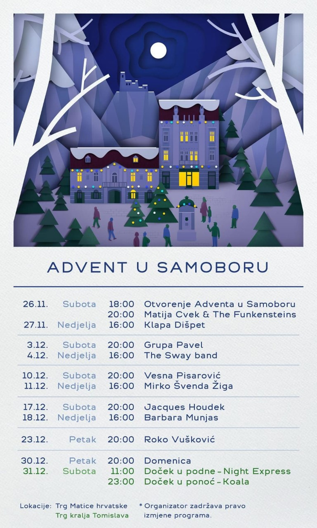 Advent u Samoboru službeno počinje 26. studenog programom na klizalištu i koncertom Matije Cveka, a dan kasnije nastupa klapa Dišpet. Spektakularan program za cijelu obitelj očekuje vas i na pop up klizalištu koje je ove godine još veće.