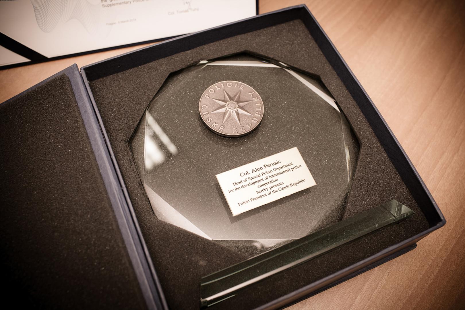 Naime, posebni izaslanik direktora češke policije, a ujedno i voditelj kontingenta češke policije u misiji, kapetan Tomaš Tesarek uručio mu je u prostorijama EULEX misije u Mitrovici posebno osobno pisano priznanje direktora češke policije pukovnika Tomaša Tuhyja, kao i kristalnu statuu češke policije. Priznanja su mu dodijeljena za posebne zasluge i doprinos u izgradnji, unaprjeđenju rada i međunarodne policijske suradnje, za podršku češkoj policiji u misiji EULEX Kosovo, kao i za njegovu međunarodnu angažiranost u suradnji u borbi protiv kriminaliteta.