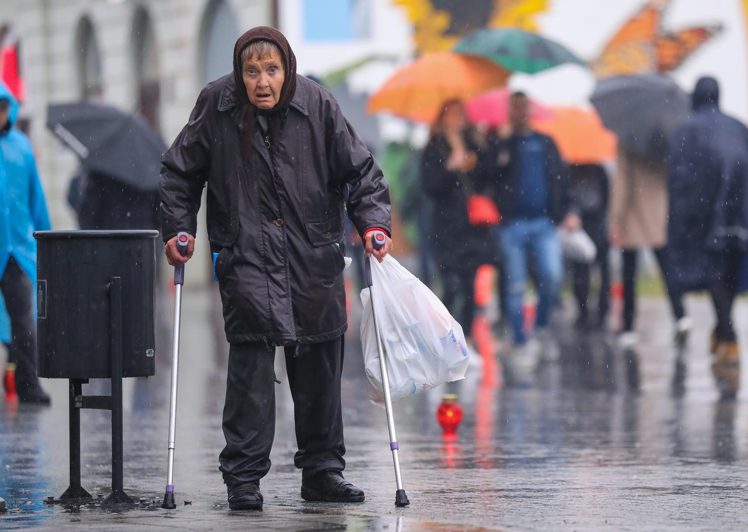 18.11.2022., Vukovar , Obiljezavanje Dana sjecanja na zrtvu Vukovara 1991. - 2022. Prigodni program "Vukovar - mjesto posebnog Domovinskog pijeteta" pocet ce u krugu Nacionalne memorijalne bolnice „Dr. Juraj Njavro“, nakon toga ulicama grada Vukovara krenuti ce Krizni put - Kolona sjecanja do Memorijalnog groblja. Baka Magdalena skuplja boce kako bi prezivjela, sudionici koji se spremaju za Kolonu sjecanja dali su joj novce kako bi se maknula sa kise. Baka je nakon toga otisla kuci Photo: Emica Elvedji/PIXSELL