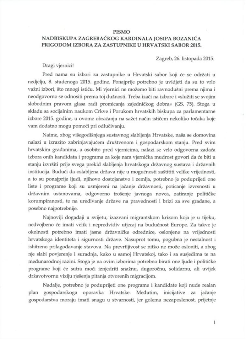 Nakon Hrvatske biskupske konferencije i zajedničke izjave hrvatskih biskupa za parlamentarne izbore, oglašavaju se biskupi pojedinačno, pa je danas svoje posebno pismo za izbore objavio i nadbiskup zagrebački kardinal Josip Bozanić.