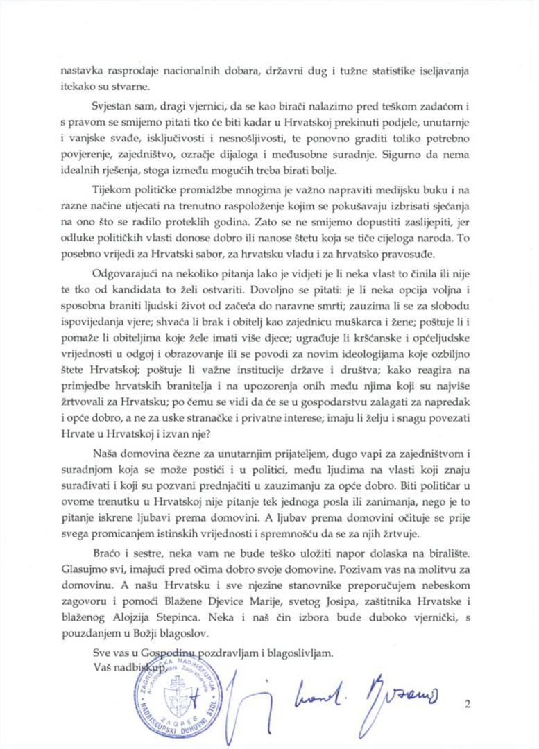 – Zbog višegodišnjega sustavnog slabljenja Hrvatske, naša se domovina nalazi u izrazito zabrinjavajućem društvenom i gospodarskom stanju. Pred svim hrvatskim građanima, a osobito pred vjernicima, nalazi se vrlo odgovorna zadaća izbora onih kandidata i programa za koje nam vjernička mudrost govori da će biti u stanju izvršiti prije svega prekid slabljenja hrvatskoga državnog sustava i državnih institucija – piše, među ostalim, Bozanić u pismu.