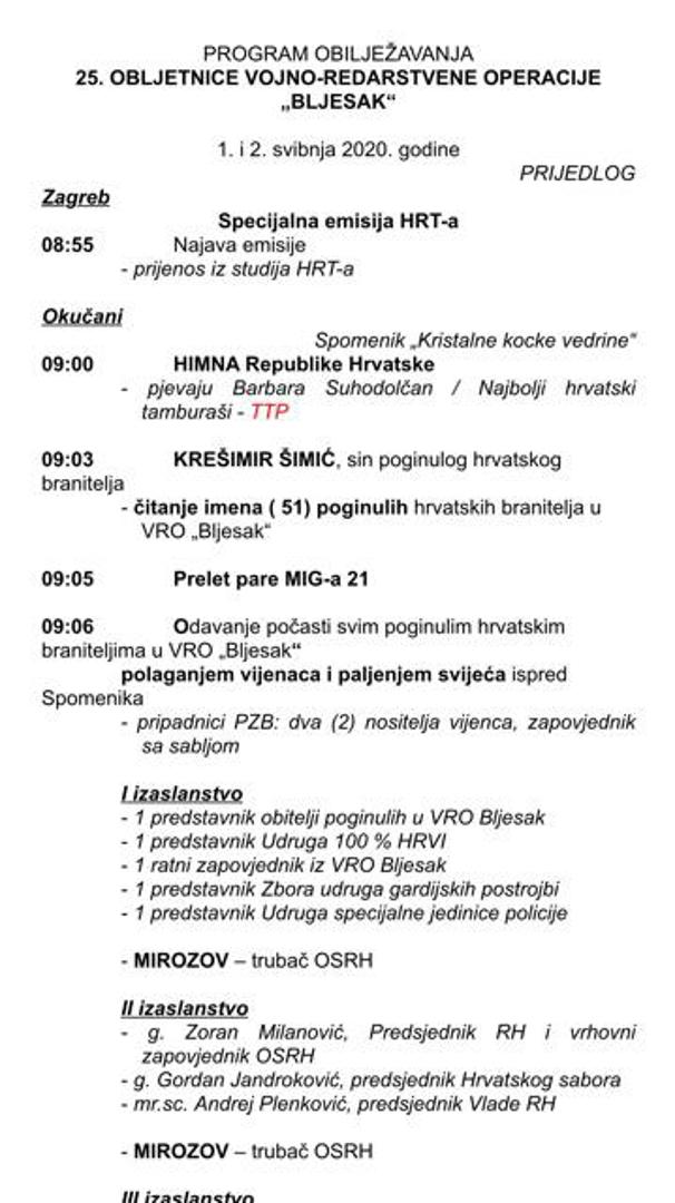 "S obzirom na različite medijske napise i tvrdnje koje se pojavljuju u javnom prostoru vezano za organizaciju obilježavanja 25. VRO Bljesak, a posebno u kojima se ministar hrvatskih branitelja Tomo Medved proziva za laži i manipulacije, Ministarstvo hrvatskih branitelja u cilju pružanja točne informacije javnosti dostavlja svoje očitovanje s obzirom na to kako je Ured predsjednika Republike Hrvatske bio upoznat s detaljima organizacije te sudjelovao u prijedlozima. Prvi pripremni sastanak za organizaciju 25. obljetnice VRO Bljesak održan je u Ministarstvu hrvatskih branitelja u srijedu, 15. travnja 2020. Sastanku su nazočili potpredsjednik Vlade i ministar obrane Damir Krstičević, ministar hrvatskih branitelja Tomo Medved, posebni savjetnik predsjednika RH za veterane Domovinskog rata umirovljeni general-pukovnik Marijan Mareković te ostali koji su sudjelovali u organizaciji (MUP, HRT, Glavni Stožer OS, Općina Okučani itd.). Nakon sastanka svi sudionici dobili su zapisnik te se daljnja komunikacija oko organizacije odvijala putem elektroničke pošte i telefonskih poziva.