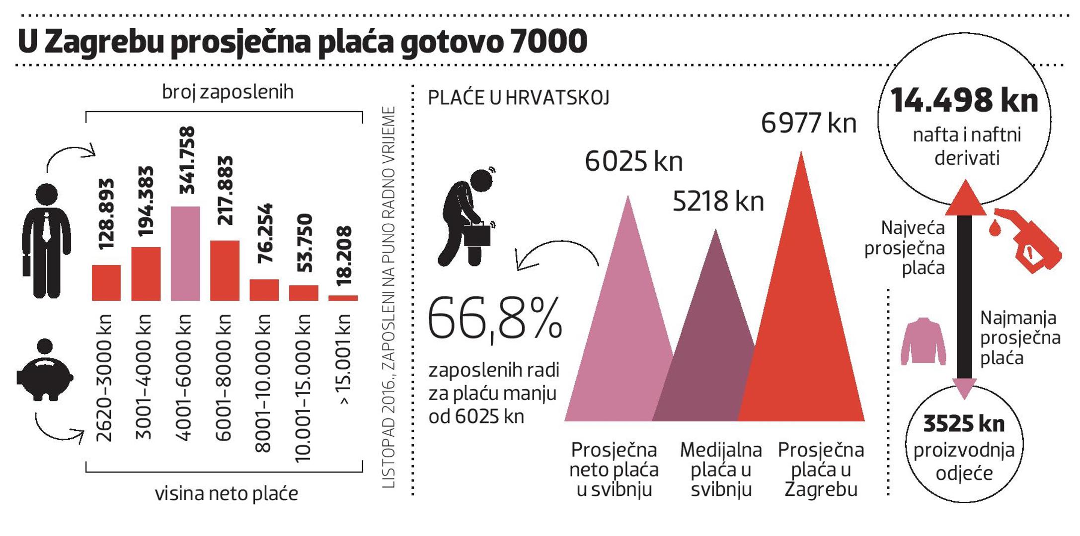 Najniže plaće, s druge strane, rezervirane su za zaštitare, trgovce te radnike u proizvodnji obuće i odjeće. Ispod prosjeka plaćeni su općenito radnici u prerađivačkoj industriji. Zagrebački podaci po kojima je prosječna plaća zaposlenika u Zagrebu za gotovo tisuću kuna viša od prosjeka Hrvatske i iznosi 6977 kuna ponovno navode na krivi zaključak da se u Zagrebu puno bolje živi nego u ostatku zemlje.