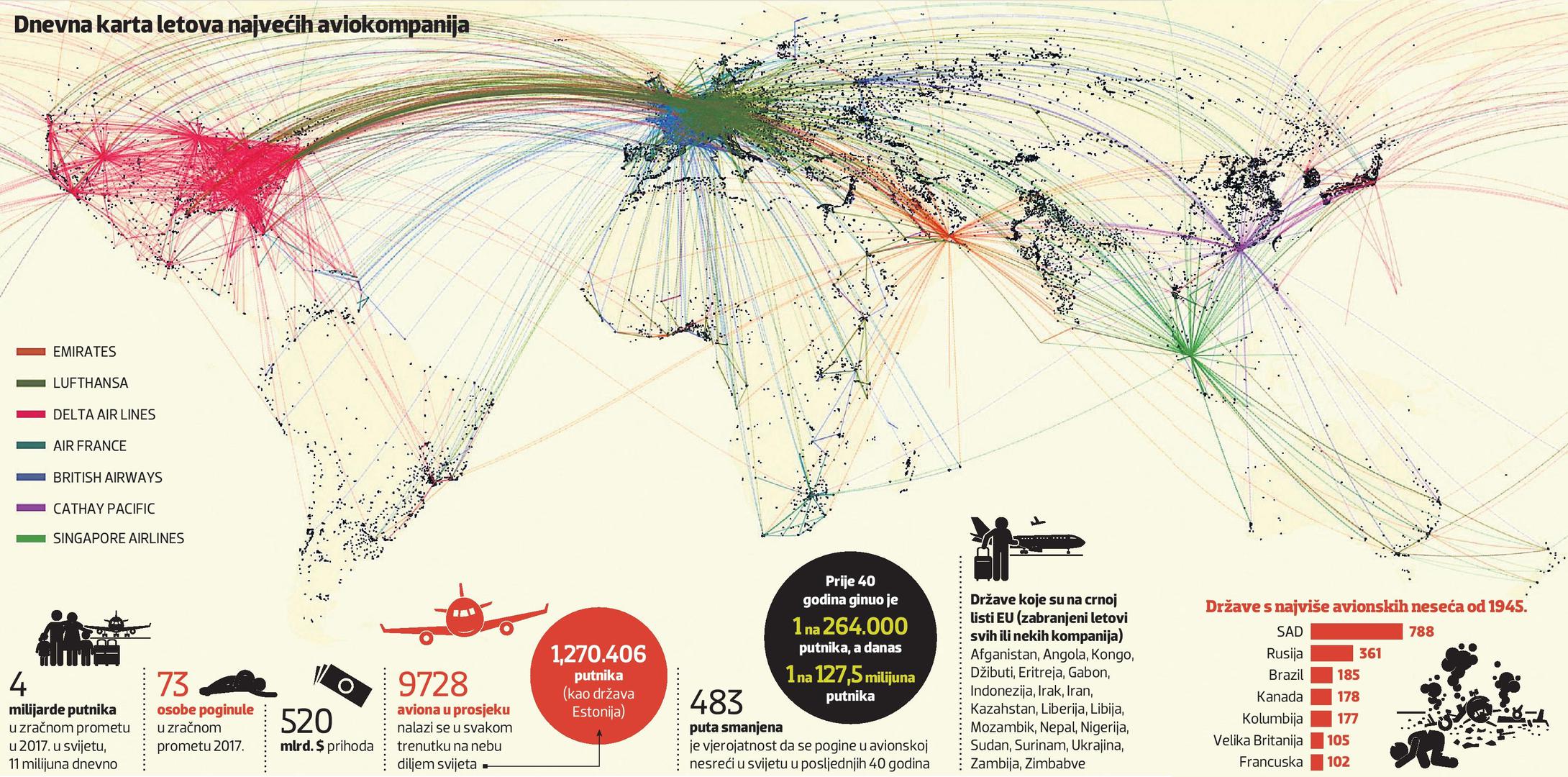 Iako svaki pad putničkog aviona odjekne u cijelom svijetu, vjerojatnost pogibije u komercijalnom avionu lani bila je jedan prema 127,5 milijuna (483 puta manje u odnosu na prije 40 godina), što je manje vjerojatno nego da će vas udariti grom. Naime, u svakom trenutku se diljem svijeta na nebu nalazi oko 10.000 aviona odnosno u zraku je oko 1,3 milijuna ljudi. Lani je zrakoplovom ukupno putovalo oko četiri milijarde ljudi, što je gotovo dvostruko više u odnosu na 2005.